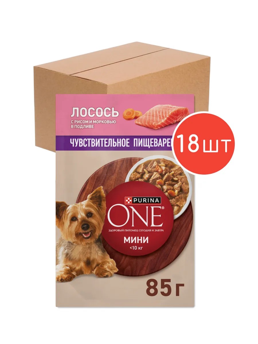 | Полное наименование товара | Влажный корм Purina ONE Мини для взрослых собак мелких и карликовых пород с чувствительным пищеварением, с лососем, рисом и морковью в подливе, 85г |