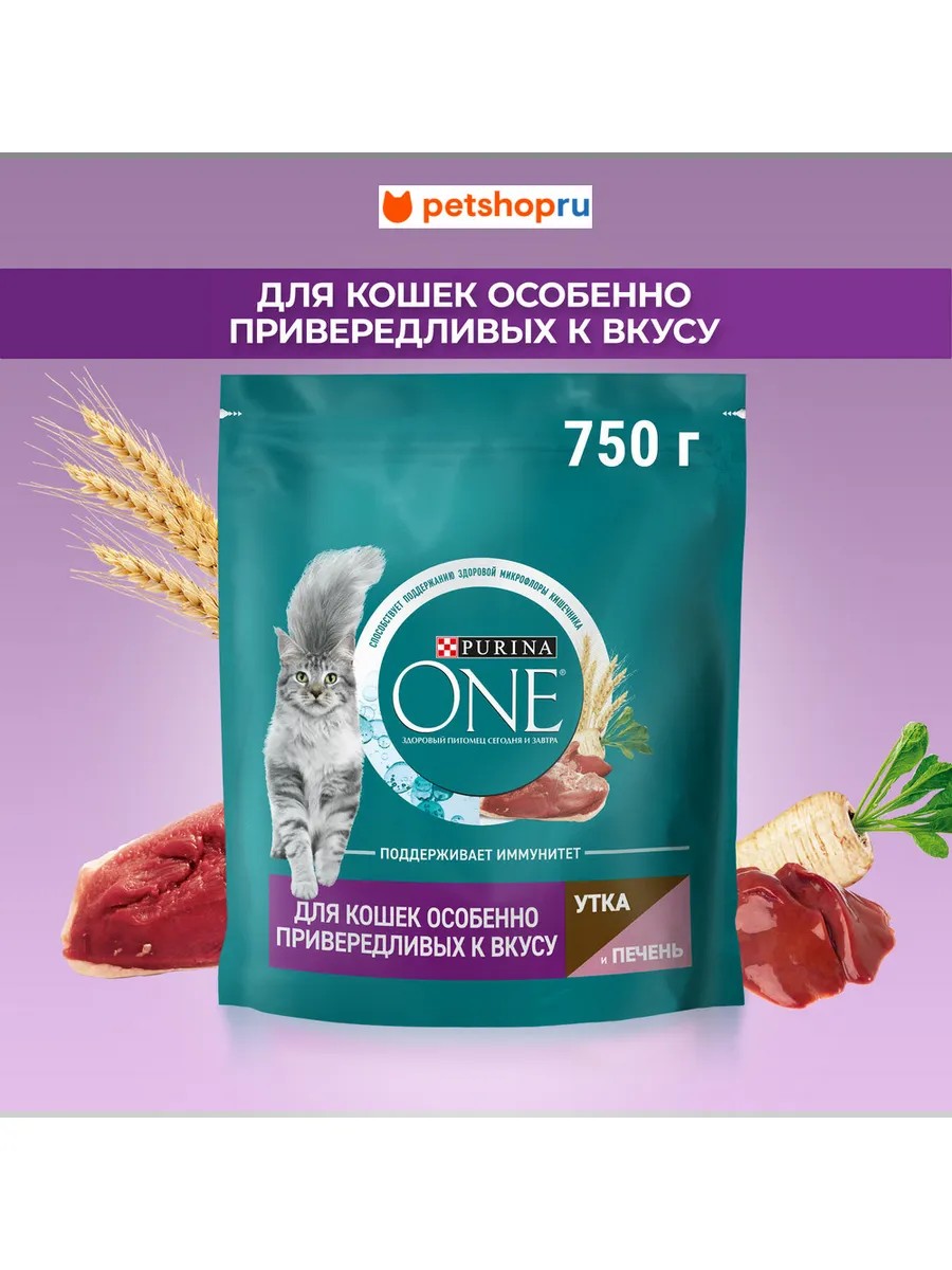 PURINA ONE Сухой корм для приверед. кошек с уткой и печенью, 750 гр