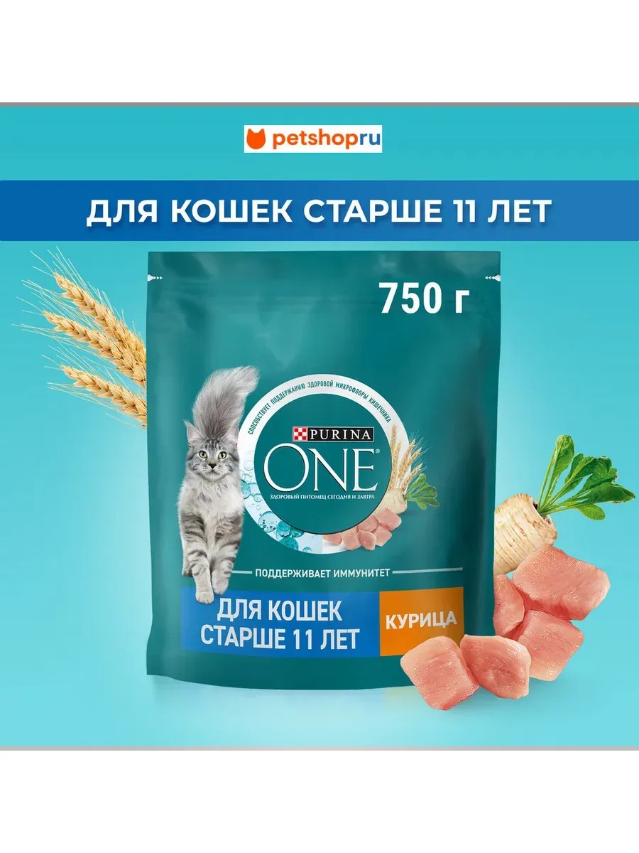 PURINA ONE Сухой корм для кошек старше 11 лет, курица и злаки, 750 гр