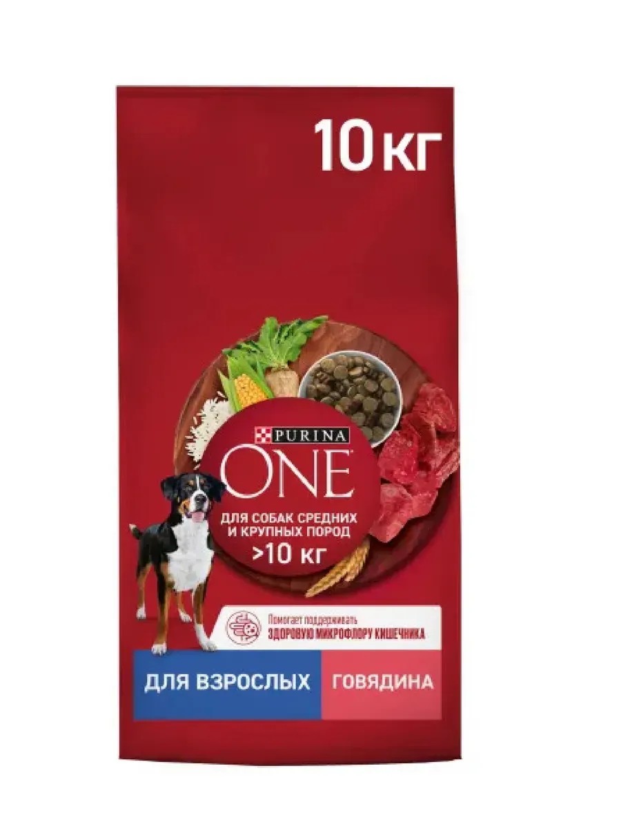 Сухой корм для собак Purina ONE с высоким содержанием говядины и с рисом 10 кг — это: