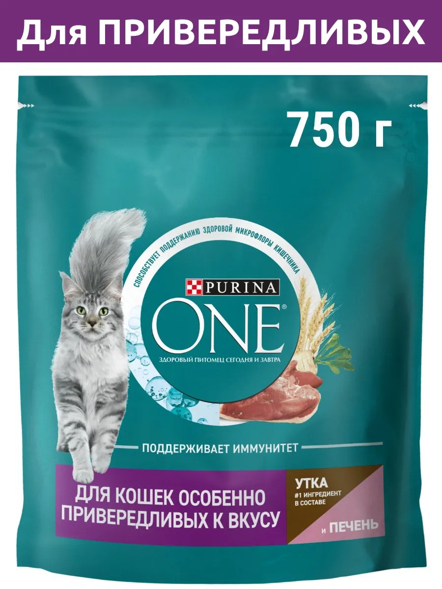 PURINA ONE Сухой корм для привередливых кошек, утка и печень 750 г