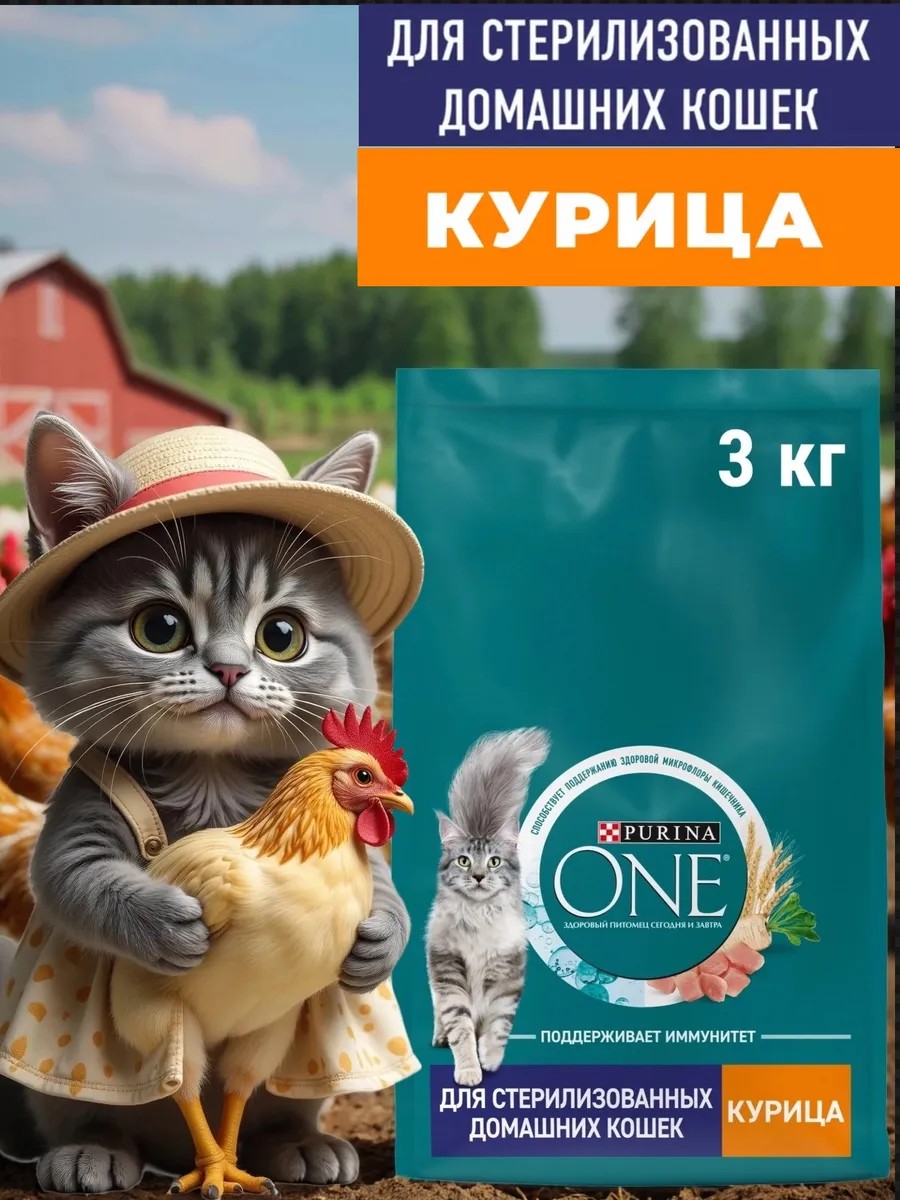 Package contents1 package of Purina One dry food for adult cats for sterilized domestic cats with chicken 3 kg; 3 kg