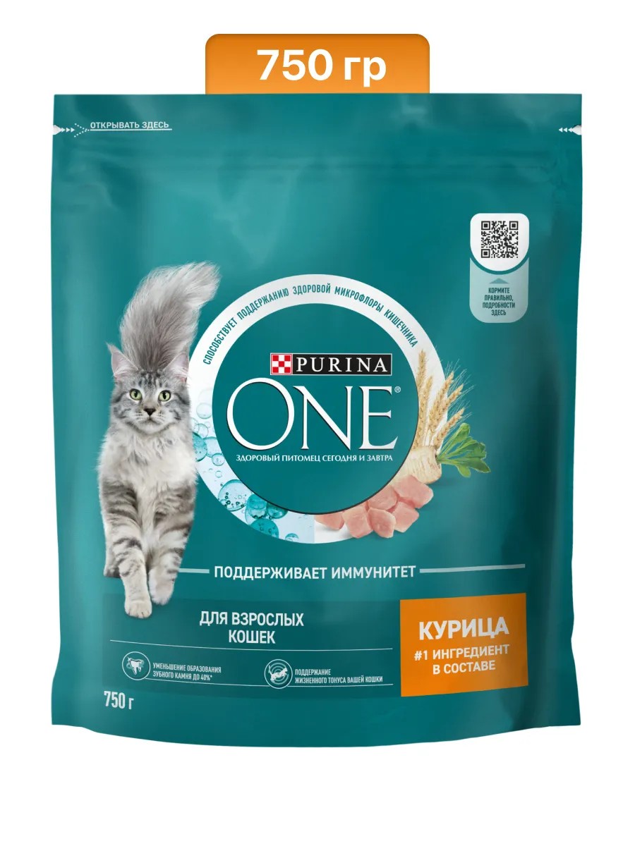Purina ONE dry cat food with chicken for adult cats is available in a 750g serving. Adulthood begins for cats 12 months and their behavior and needs change. Food for adult cats should support their activity levels and address potential risks associated with limited activity due to indoor living. Purina experts have developed dry cat food for adult cats with your pet's needs in mind. A diet with high-quality ingredients will help ensure your pet has the energy they need for years to come. High-quality protein provides energy and helps maintain optimal weight. A natural prebiotic from chicory root supports digestion. The kibble texture of this dry food helps cleanse teeth of bacterial plaque. Essential Omega 3 and 6 fatty acids and zinc promote a healthy, shiny coat. Purina One dry cat food contains no artificial colors, flavors, or preservatives. High-quality chicken or beef is a source of protein and excellent taste.