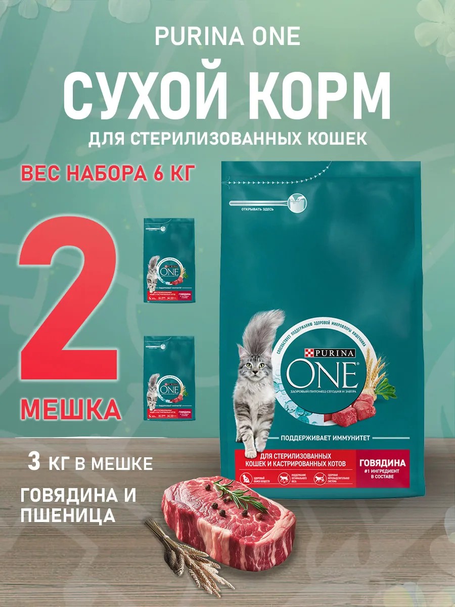 PURINA ONE Корм сухой стерилизованных кошек говядина пшеница 3 кг 2 шт