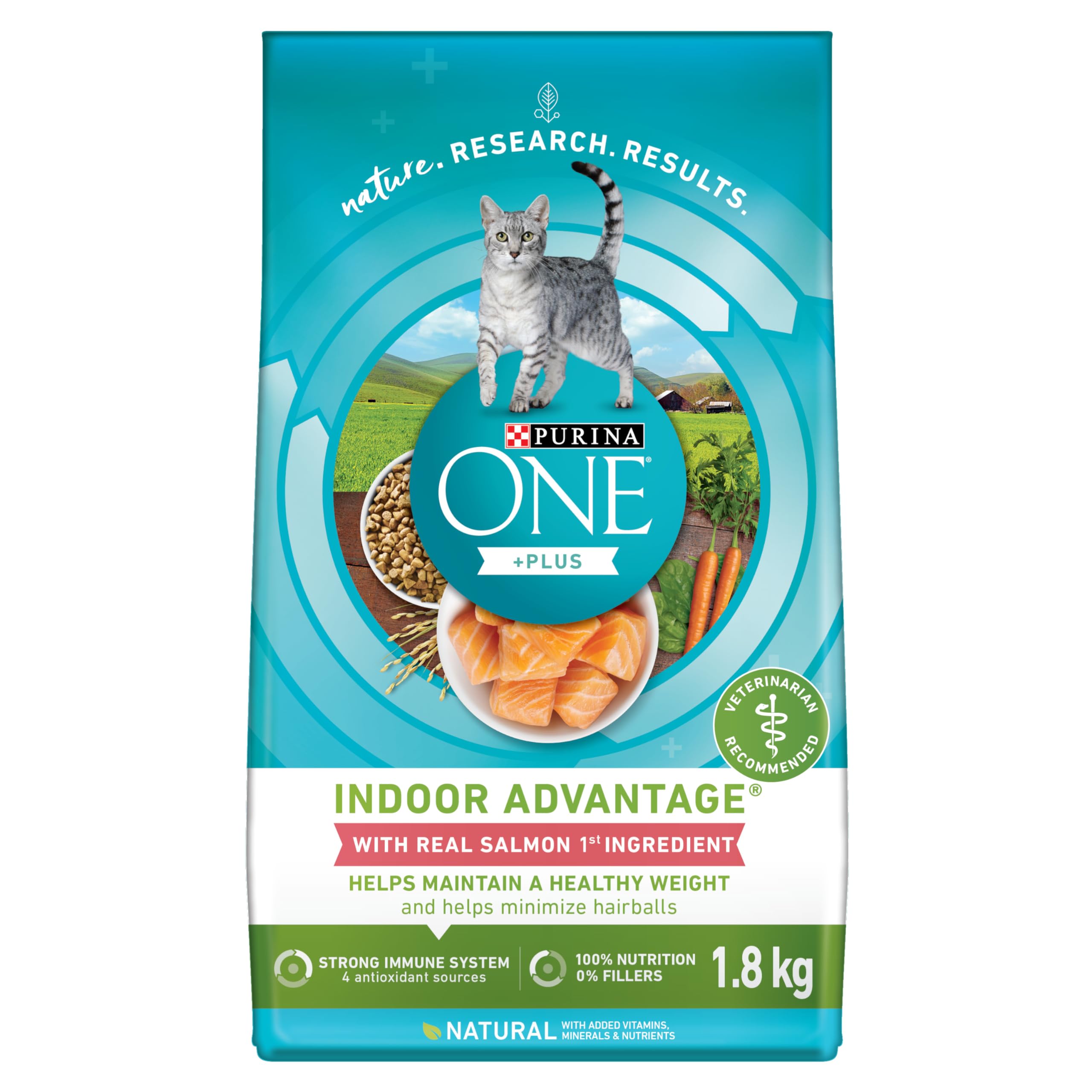 Nature. Research. Results. No matter how far science advances us, we always look to nature to inspire us. Purina ONE Plus Indoor Advantage combines nature and research for results you can see in your cat. That includes a SmartBlend of high-protein nutrition to help maintain a healthy weight, in a fibre-rich formula optimized to meet the unique needs of indoor cats. See the results Purina ONE can make in your cat. Purina ONE Cat Plus Tailored Formulas build on an already solid foundation, creating tailored pet food options that support specific needs like healthy weight, healthy aging, hairballs and more. From energy and immune health to strong muscles, including a healthy heart, these high-quality formulas combine nature and research for results you can see in your cat. Try dry food options from veterinarian recommended Purina ONE today.Natural With Added Vitamins, Minerals Nutrients. 4 Antioxidant Sources Support Immune Health. Natural Fibre Blend Minimizes Hairballs. Helps Maintain a Healthy Weight. Real Salmon is the 1 Ingredient.