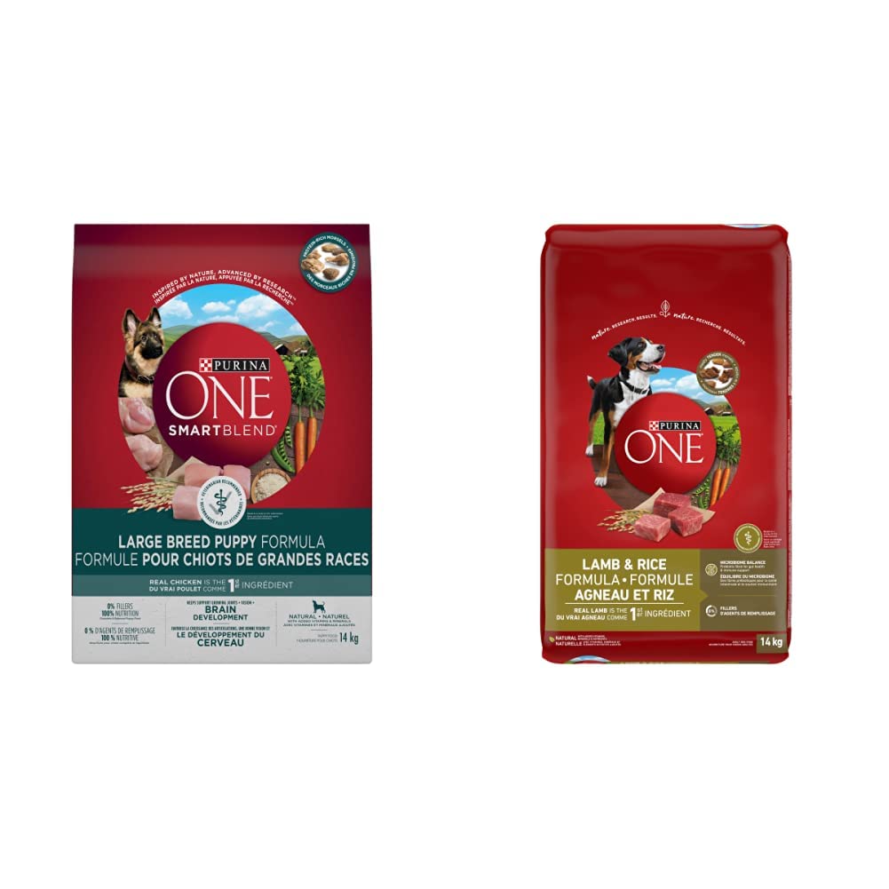 Purina ONE Smartblend Large Breed Puppy Food, Dry Dog Food 14 kg Bag Give your large breed puppy the nutrition he needs to get a great start in life with Purina ONE SmartBlend Natural Large Breed Puppy food. Real chicken is the #1 ingredient in this dry puppy food, so you can rest easy knowing he's getting a meal made with high-quality ingredients. This dog food recipe features easily digestible nutrition with rice for your puppy's delicate stomach. Natural sources of glucosamine in every serving help to support his growing joints, and high protein in every serving help to support his strong muscles and heart. The protein-rich, tender and meaty morsels and crunchy kibble combine to deliver a taste and texture he's sure to love with every bite. Serve your growing large breed puppy a meal option that helps maintain his ideal body condition and gives him the nutrition he needs to live a healthy life with you. Fill his dish with this Purina ONE dry puppy food to show him just how important he is to you. Purina ONE Smartblend Natural Dry Dog Food, Lamb & Rice 14 kg Discover what makes SmartBlend smart. Purina ONE SmartBlend Natural Lamb & Rice Formula adult dry dog food starts with real lamb as the #1 ingredient to help maintain your dog's strong muscles, including a healthy heart. Each meal is highly-digestible and has a combination of protein-rich tender, meaty morsels and crunchy kibble, providing a taste your dog will love to help ensure he gets the complete and balanced nutrition he needs. This food for dogs has a dual-defense antioxidant blend of vitamins E and A and minerals zinc and selenium to help support his strong immune system while promoting healthy dog skin, and natural sources of glucosamine help support healthy joints. Give him a premium dog food variety that he's sure to love, and give yourself the convenience and quality you love. Order Purina ONE SmartBlend Natural Lamb & Rice, which is carefully formulated by Purina dog experts and nutritionists who are committed to delivering a positive impact on your dog's health.