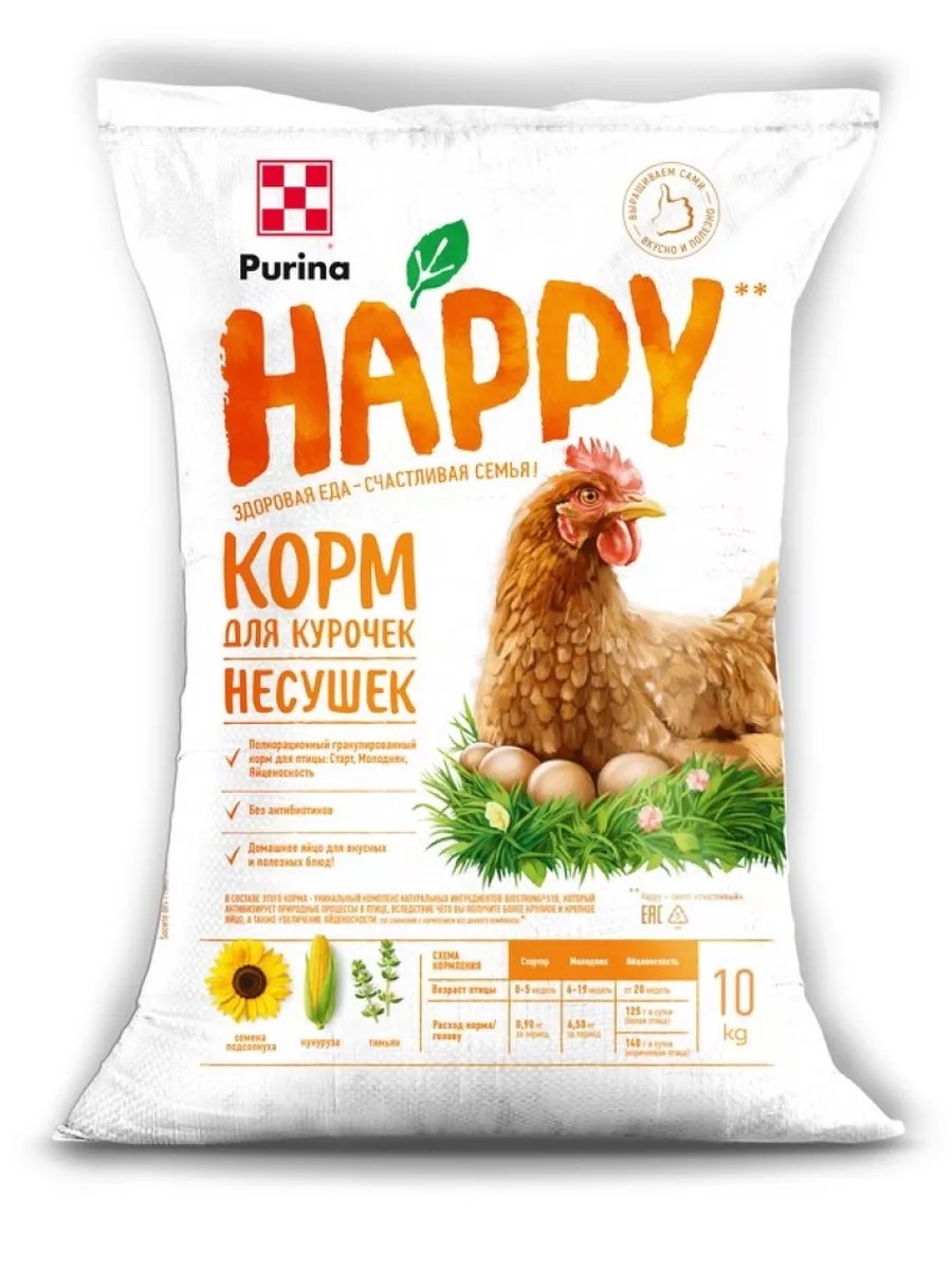 The Purina HAPPY line of poultry feed for laying hens. Carefully raised – with love, without antibiotics*. Complete, balanced feed for young laying hens, Start (2119, 0 to 5 weeks) with an increased content of plant extracts (phytogenic BIOSTRONG 510), which activate beneficial processes in the bird's body and ensure its full development and productive longevity. - Up to 320 eggs per year from a laying hen - for a long time! - Bright and rich yolk color - High activity, good appetite - Optimal egg weight, no cracks *The use of antibiotics and medications is at the discretion of the buyer. Release form: 2 mm granules Ingredients: Cereals, soybean products, wheat product, meal, limestone, phosphates, amino acids, molasses, raw materials of animal origin, vitamin and mineral premix, vegetable oil, macronutrients, choline chloride, salt, phytogenics, granule fixative, probiotic, antioxidant.