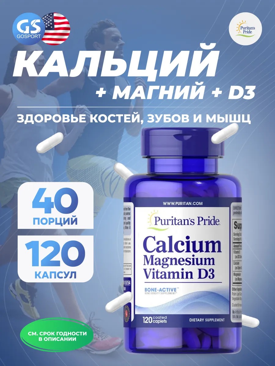 Годен до 31.08.2026. Кальций & магний Calcium Magnesium Vitamin D3 120 капсул. Эта добавка 3 в 1 содержит Bone-Active, которая разработана для поддержания плотности и прочности костей, поддерживая оптимальное здоровье костей. Независимо от вашего возраста, вам нужно заботиться о своих костях. Поддерживать здоровье костей с помощью высококачественного кальция, магния и витамина D просто с этой универсальной добавкой. Каждое из этих питательных веществ играет важную роль в поддержании здоровья костей. Кальций и магний важны для мышечных сокращений, а также для здоровья костей. Витамин D способствует здоровью иммунной системы. Кальций является основным минералом, отвечающим за прочность костей и зубов, а магний и витамин D необходимы для транспортировки и усвоения кальция. Достаточное потребление магния необходимо для поддержки сокращения и расслабления мышц и помогает при судорогах в ногах. 3 питательных вещества, необходимых для здоровья костей Добавка для плотности костей Поддерживает крепкие зубы Магний помогает при судорогах в ногах и улучшает мышечную функцию. Рекомендации по применению Взрослым принимать по три (3) капсулы в день, желательно во время еды.