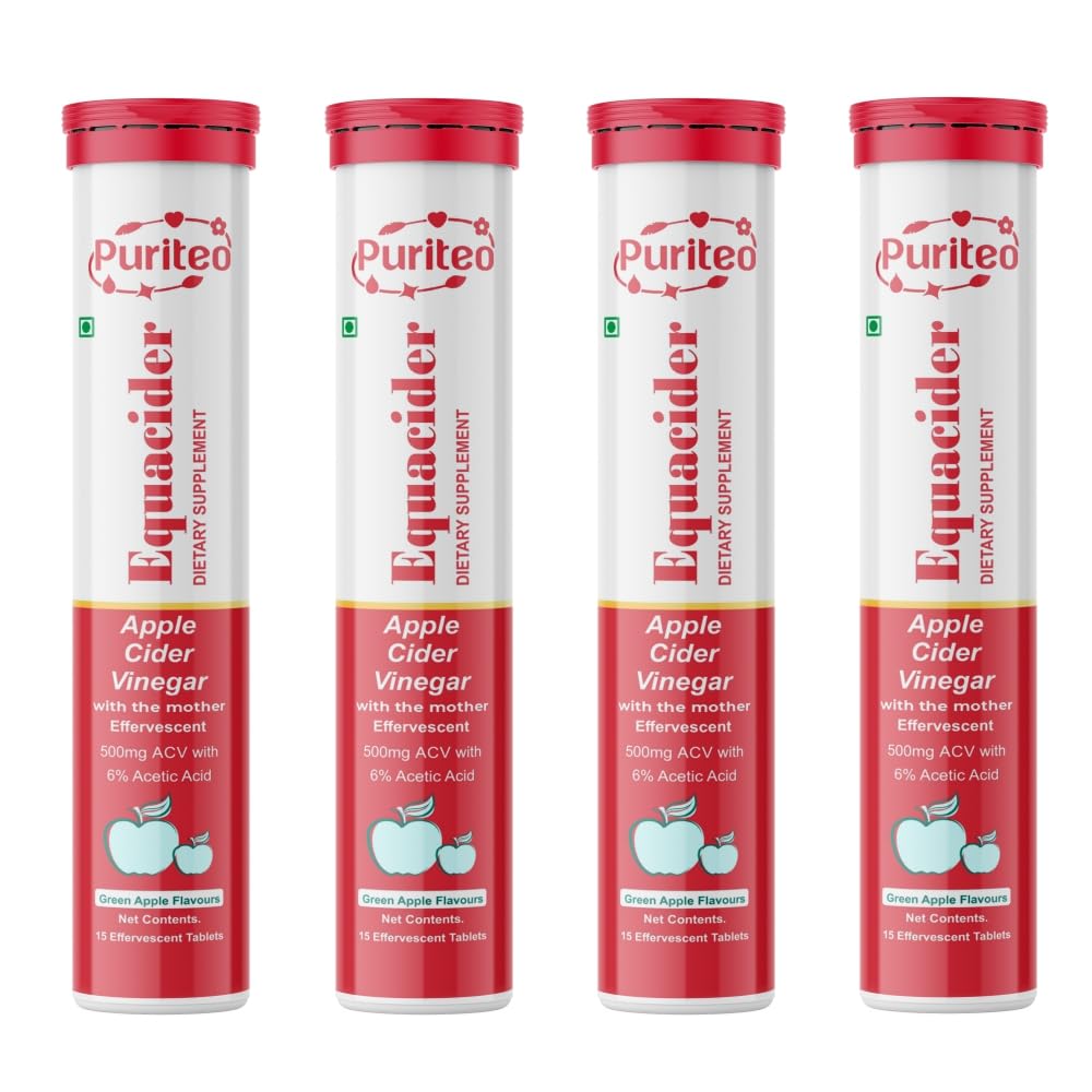 PURITEO-EQUACIDER Apple Cider Vinegar Effervescent Tablets with The Mother Vegan No Added Sugar Non-GMO & Gluten-Free Tablet - (60 Tablets Pack of 4)