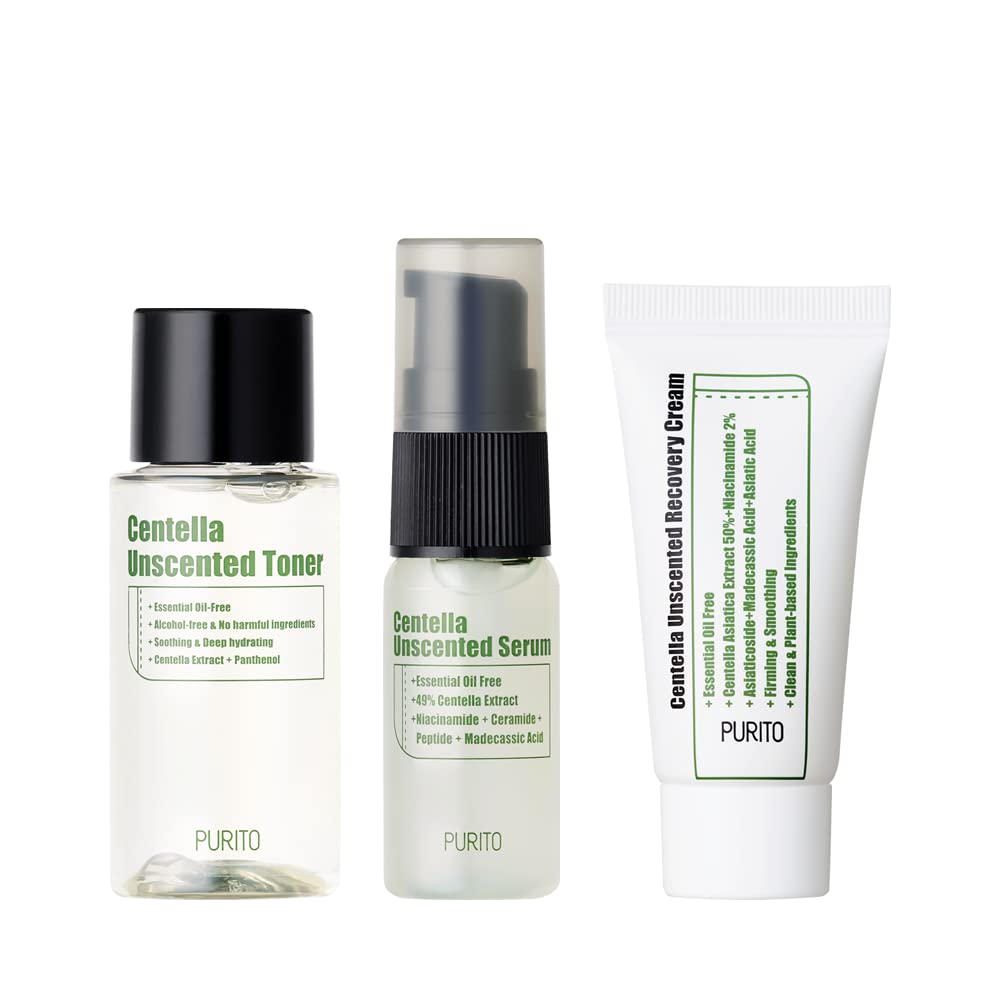 Centella Unscented Recovery Cream (12 ml 0.4 fl.oz.) The Centella Asiatica Extract (50 ) soothes and moisturizes the irritated skin keeping skin radiant and healthy. It helps strengthen the skin barrier preventing the evaporation of moisture inside the skin. Centella Unscented Serum (15 ml 0.5 fl.oz.) This serum rejuvenates the skin by strengthening its barrier. It contains Centella Asiatica Extract, Niacinamide, Ceramide and Panthenol to restore a damaged skin barrier and soothe irritated skin. Centella Unscented Toner (30 ml 1.01 fl.oz.) 10 Centella Asiatica Extract and Panthenol soothe and relieve irritated skin. With a low pH of 5.5 and alcohol-free properties, this toner can be used on sensitive skin in the first step of your skincare regimen. A set of three mini Centella Unscented products to calm and soothe your skin. No matter where you are, a travel-friendly mini kit will keep your skin look glowing and healthy.