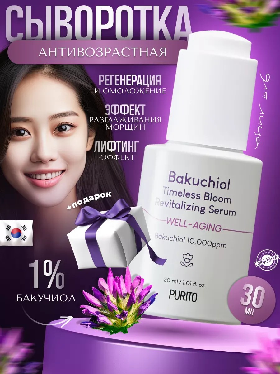 Сыворотка для борьбы с первыми возрастными изменениями Purito Bakuchiol Timeless Bloom Revitalizing Serum помогает замедлить старение кожи, активизирует процессы регенерации, обладает ревитализирующим действием и пробуждает спящие клетки.