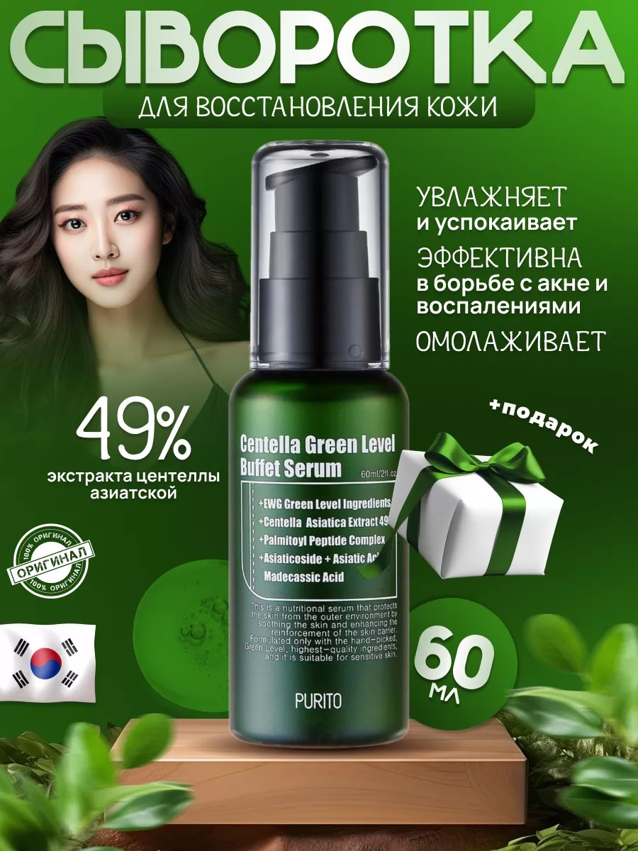 Is your skin tired and in need of urgent restoration? Then Centella Green Level Buffet Serum from the Korean brand PURITO is just what you've been looking for! This natural, multifunctional product is suitable for all skin types. It can be used in two ways: as a toner: apply the product with a patting motion and massage into the skin. As a serum: apply to damp skin, and seal in the effect with a nourishing cream. Whichever way you use the product, you can be sure that your skin is reliably protected by the serum's natural ingredients. When should you use Centella Green Level Buffet Serum? If your skin is dehydrated. If your skin has become dry, flaky, or tired. If the first signs of aging appear: wrinkles, fine lines, and sagging skin. If you are prone to rosacea. The serum can strengthen capillaries, improve microcirculation, and tighten vascular walls. What are the key features of the Centella Green Level Buffet Serum? The product is safe and environmentally friendly, as confirmed by its EWG Level 1 and Level 2 certifications. It contains only natural ingredients that undergo rigorous testing before being added to the product. 49% of the product is centella asiatica extract, which has a number of beneficial properties and a healing effect. The serum is free of allergenic ingredients, dyes, and fragrances that could negatively impact skin health.