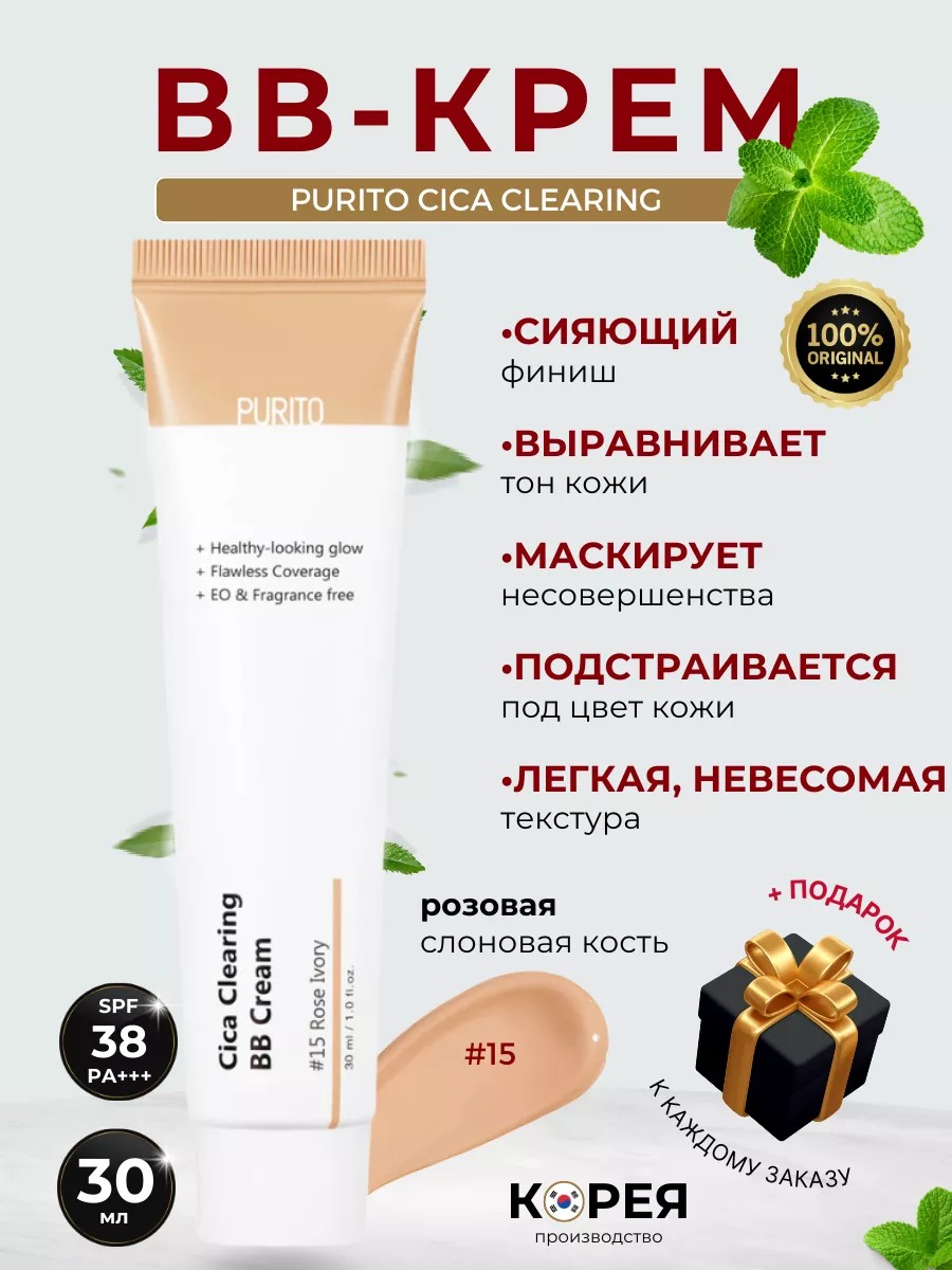 Purito Cica Clearing BB Cream SPF38/PA+++, a BB cream for sensitive skin with centella extract, evens out skin tone, conceals imperfections, and creates a natural, radiant finish.