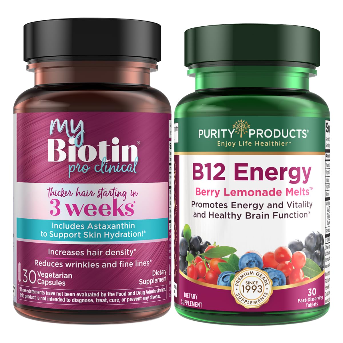 Purity Products Bundle - MyBiotin ProClinical + B-12 Energy Melt MyBiotin ProClinical (Biotin Patented MB40X Astaxanthin) - B12 Berry Melt (Methylcobalamin B12 + B6 + D3 + More)