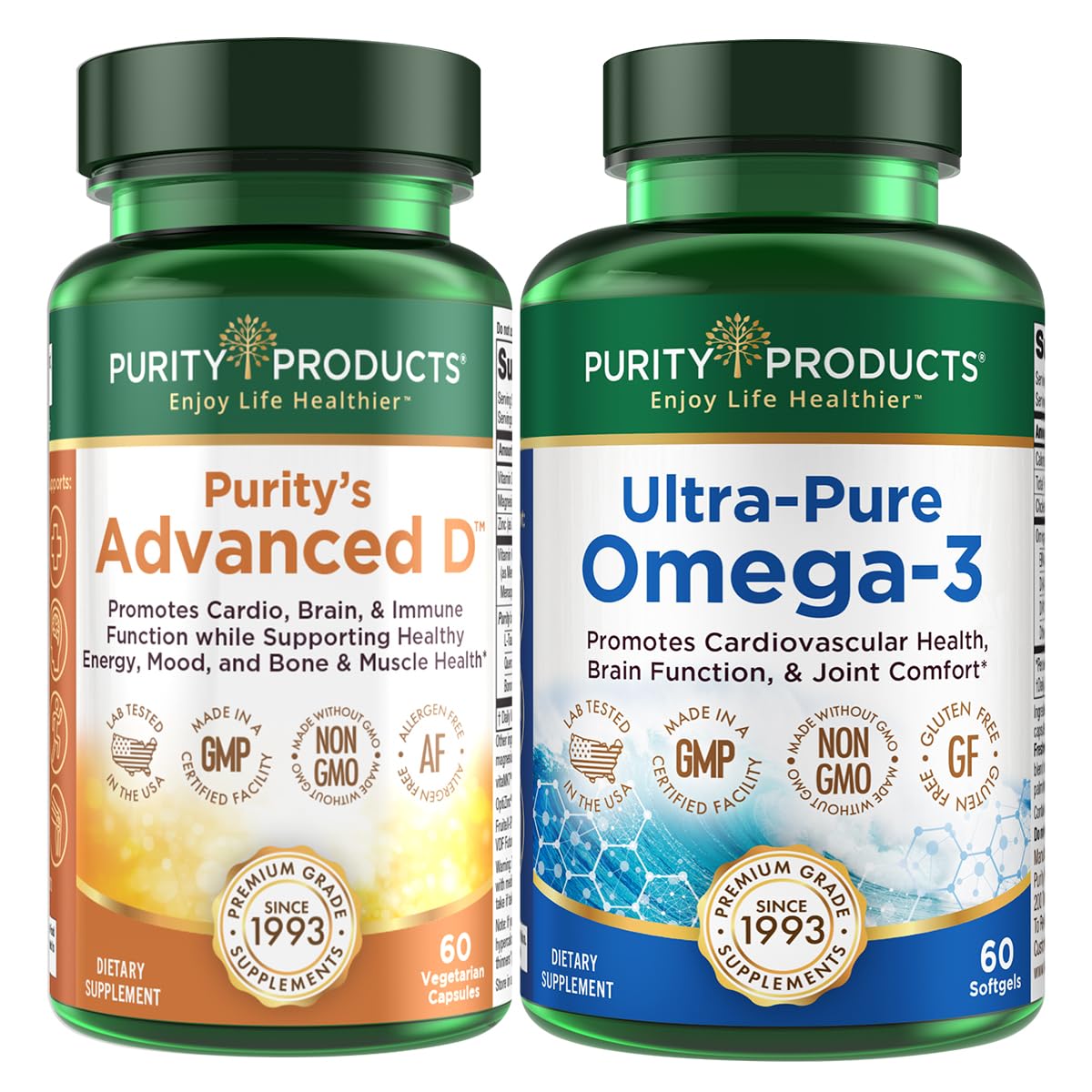 We've combined the benefits of our super concentrated Omega-3 Fish Oil with the incredible health supporting benefits of Vitamin D in one convenient 2-Bottle Kit. Featuring our Ultra Pure Omega-3 Fish Oil plus 5,000 IUs of Dr. Cannell's Advanced D Super Formula. Benefits of Ultra-Pure Omega-3 Fish Oil The two key active ingredients in Fish Oil, DHA and EPA, are widely recognized for their positive influence on many organs and tissues. Fish Oil comprehensively supports healthy heart and cardiovascular function, circulation, the structure and function of cellular membranes, healthy brain development and even healthy skin. Ultra Pure, Super Concentrated Fish Oil As part of Purity's commitment to product quality, not only are these Fish Oils concentrated, but they are "molecularly distilled." This process removes contaminants and locks in the purity. Each 2 soft gel serving contains 1125 mg of a super potent provision of Omega-3's with 565 mg of EPA and 435 mg of DHA. Purity's exclusive soft gel encapsulation process also includes a proprietary - non-repeating - antioxidant blend to maintain freshness. The Vitamin D Revolution Vitamin D's influence on biological functions vital to one's health and well-being mandates that vitamin D supplementation can no longer be ignored by individuals striving to achieve and maintain a greater state of health. Formulated by the Executive Director of the Vitamin D Council, Dr. John J. Cannell, Purity's new Vitamin D Complex is a blend of Vitamin D with several targeted nutrients which complement many of the Vitamin D's desirable health benefits. Advanced D contains no milk, eggs, soy, wheat, tree nuts, fish, shellfish or gluten. Ultra Pure Omega-3 contains no milk, eggs, wheat, tree nuts, shellfish or gluten.