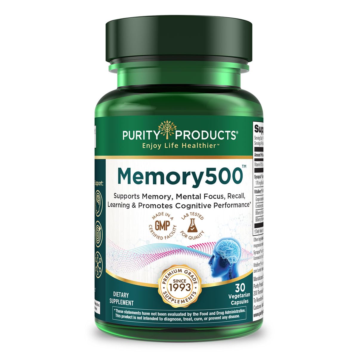 EASY TO SWALLOW CAPSULES- Just one pill per day!. STATE-OF-THE--ART CLINICAL RESEARCH! 6 targeted randomized placebo controlled clinical trials. Over 30 years of research!. SHORT TERM AND LONG TERM BENEFITS - Studies show support for two distinct types of benefit from this unique Bacopa: 1. Daily, long-term use (chronic) to enhance learning and memory, and 2. Short-term use (acute) to improve mental performance. PROMOTE PEAK COGNITIVE PERFORMANCE- Memory 500 features a unique standardized extract of Bacopa monnieri with a wide range of active constituents. Patented extraction process!. THE ULTIMATE SCIENCE-BASED NOOTROPIC ?- In 6 double-blind, placebo-controlled clinical studies, healthy adults using Synapsa showed significantly improved performance in areas such as visual processing, learning rate, working memory, information retention and mental performance in cognitively demanding environments.