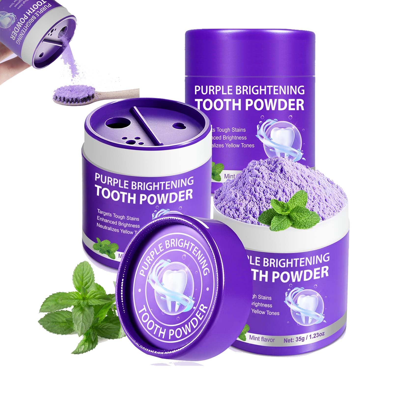 Ultra-Convenient 35g Powder Pack:Built-in mess-free sprinkler lid for precise application. Use alone or with your toothpaste, perfect for home travel.Just sprinkle, brush glow!. Refreshing Mint Freshness:Infused with a cool, refreshing mint scent, it leaves your mouth feeling fresh and clean, helping improve oral odor after each use. Enamel-Safe Non-Irritating Sensitive Care:Formulated to be enamel-safe and non-irritating, it's ideal for sensitive teeth and gums, providing a comfortable cleansing experience for daily use. Stain Yellow Tone Reduction:It gently lifts surface stains from coffee, tea, and daily habits, helping reduce yellowing for a cleaner tooth appearance. Purple Teeth Whitening Powder Color Correcting :Formula:color-correcting tooth balances tooth tone and neutralizes yellow undertones for an even-looking smile, without harsh bleaching agents.