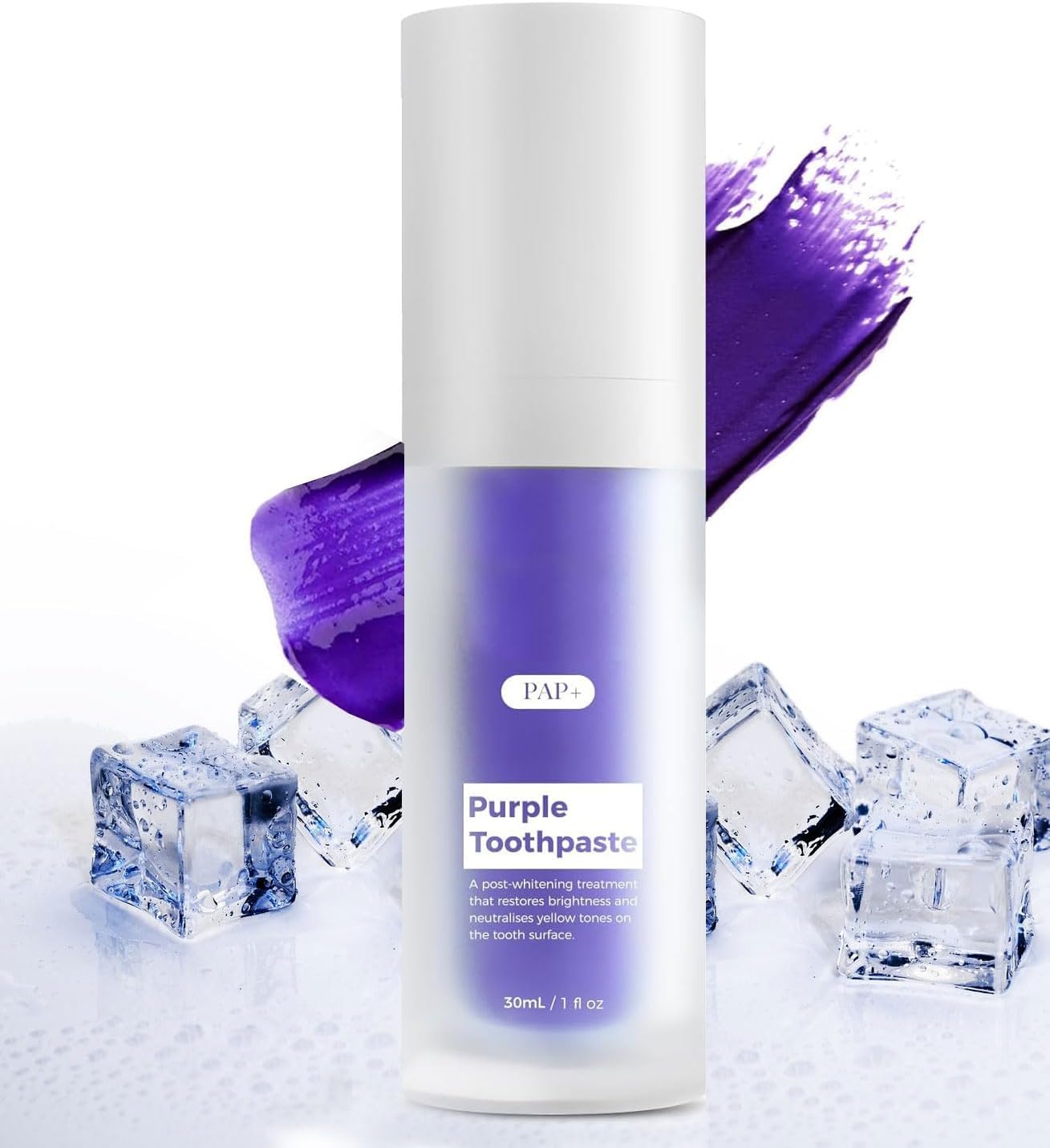 minutes to maximize results. ✓ Not a Standalone Whitening Treatment – This teeth whitening toothpaste is ideal for individuals with pre-whitened teeth looking to maintain their brightness. It is not meant for deep whitening but enhances and prolongs the effects of prior whitening treatments. ✓ Perfect for Daily Use Maintenance – Use as the final step in your oral care routine or before heading out for a brighter smile. Simply brush your teeth as usual and follow up with our purple toothpaste for teeth whitening for 2 minutes to maximize results. ✓ Instant Brightening Stain Removal – Designed to enhance your teeth whitening results, this best whitening toothpaste works by counteracting yellow discoloration from coffee, tea, wine, and smoking, providing immediate improvements in tooth color. ✓ No Sensitivity Safe for Enamel – Unlike traditional whitening toothpaste with hydrogen peroxide or carbamide peroxide, our teeth whitening toothpaste is non-abrasive and gentle on your enamel and gums, ensuring a pain-free experience. ✓ Advanced Purple Toothpaste for Teeth Whitening – Our innovative colour-correcting formula neutralizes yellow tones using two water-soluble dyes, helping you achieve a visibly brighter, whiter smile without the use of harsh bleaching agents.