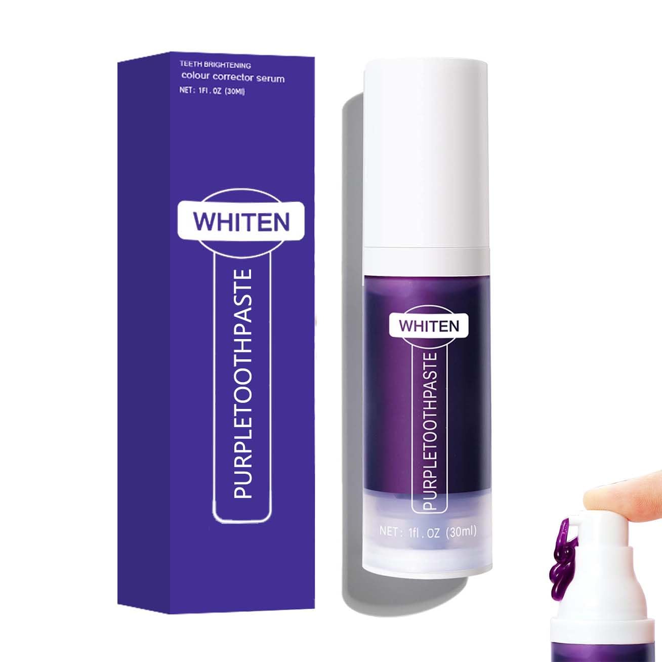 Transform your smile with this innovative purple toothpaste that goes beyond ordinary whitening. The unique purple-tinted formula acts as a color corrector, helping to neutralize yellow stains on your teeth for a brighter, more confident smile. Featuring a gentle foam consistency, this toothpaste is specially designed for those with sensitive teeth, allowing for gentle yet thorough stain removal without discomfort. The non-irritating formula is safe for your enamel and gentle on gums, making it perfect for daily use. Experience the difference as stubborn stains fade away, revealing a more even-toned, clean-looking smile. The carefully balanced formula provides thorough cleaning while respecting your mouth's delicate balance, so you can enjoy the benefits of whiter-looking teeth without compromiseSafe for Daily Use Post-Whitening Maintenance:A gentle daily whitening booster that complements (not replaces) full whitening treatments. It maintains brightness, prevents future discoloration, and nourishes gums without residue or damage, helping you sustain a radiant, confident smile every day. Easy to Use Travel-Friendly Design:Simply apply 2 pumps to your toothbrush and brush for 2 minutes after regular brushing—no complicated steps or tools needed. The air-pump vacuum bottle dispenses just the right amount, minimizes waste, and is compact enough for travel, home, or office use. Deep Stain Removal Long-Lasting Freshness:Effectively lifts stubborn stains from coffee, tea, wine, and smoking while reducing pigmentation and discoloration. The rich, fine foam penetrates between teeth for a thorough clean, while herbal extracts eliminate oral odors and keep breath fresh for hours. Gentle Non-Irritating for Sensitive Teeth:Formulated without harsh abrasives, hydrogen peroxide, or carbamide peroxide, this enamel-safe and gum-friendly toothpaste provides a pain-free whitening experience. Its mild, plant-based ingredients avoid sensitivity and irritation, making it ideal for daily use by those with sensitive teeth. Color-Correcting Purple Formula for Instant Whitening:Harnesses advanced color wheel technology to neutralize yellow undertones and cancel surface stains, delivering an instantly whiter, more radiant smile. This peroxide-free purple toothpaste works in just 2 minutes, perfect for post-brushing touch-ups or on-the-go use before heading out.