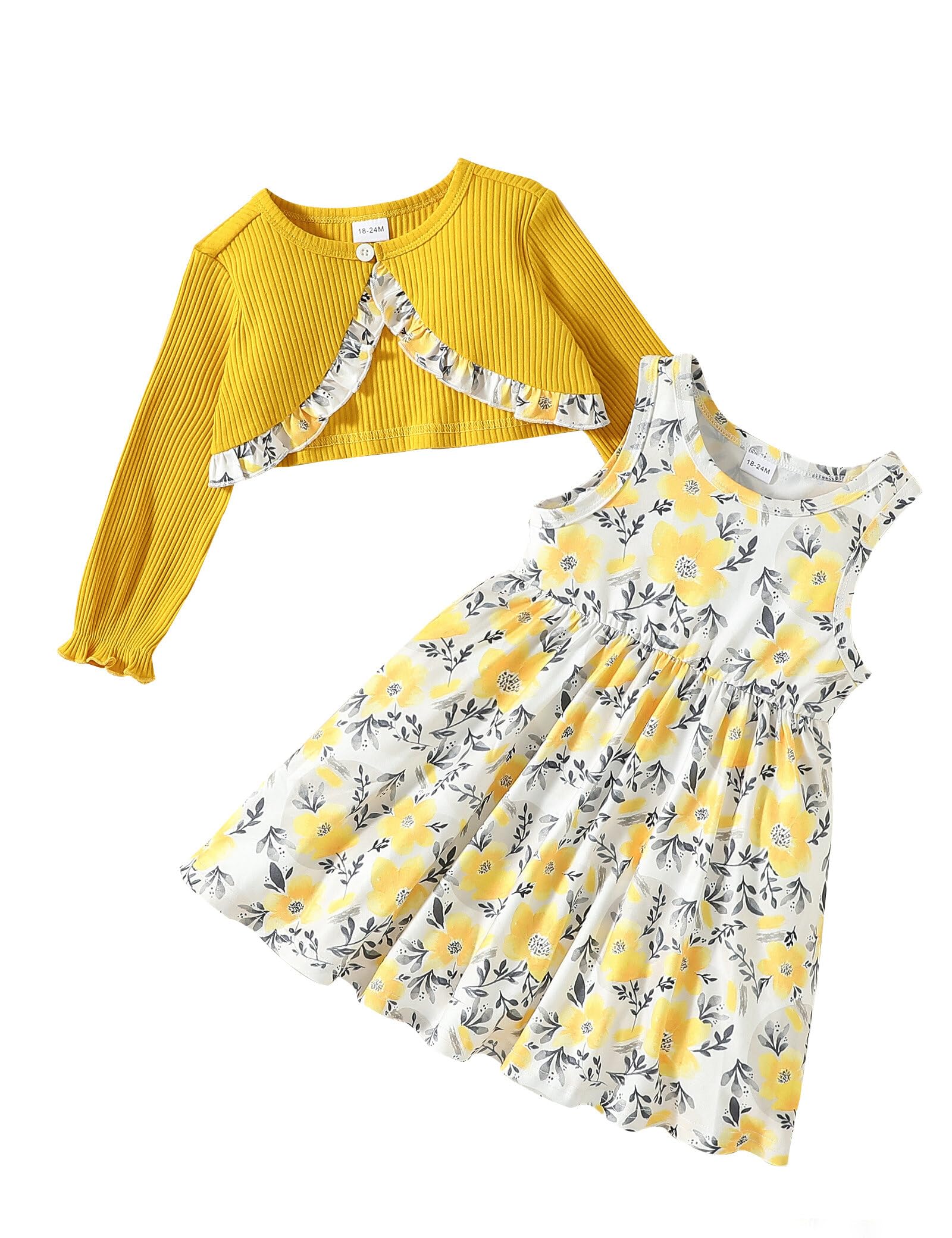 puseky Toddler Girl Dress and Cardigan 2 Piece Girl Floral Print Sleeveless Dress and Ribbed Cardigan Coat Set 5-6 Years Yellow