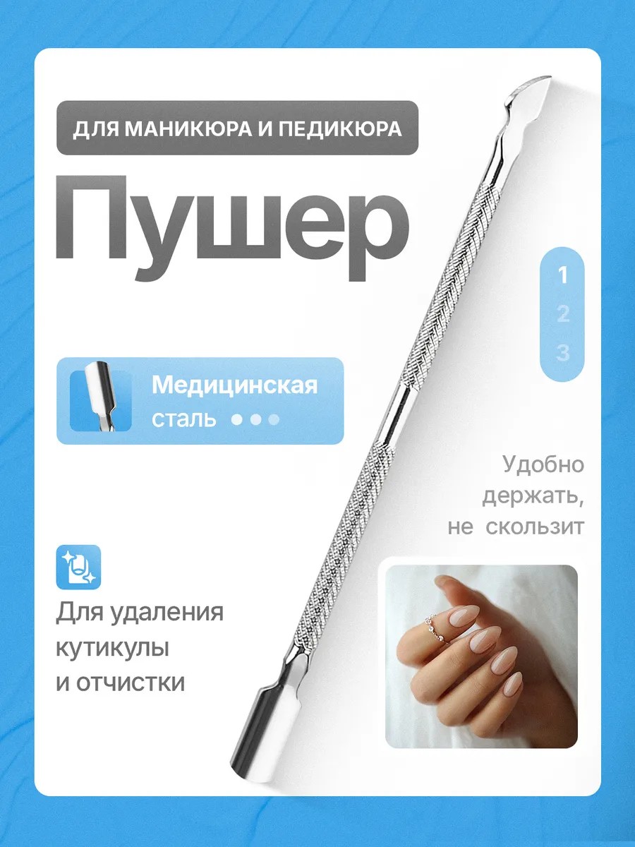Пушер – это незаменимый инструмент и прибор в арсенале любого ценителя безупречного маникюра и педикюра. Наш металлический двухсторонний пушер, имеет двойную функциональность, разработан для бережной заботы о пальчиках. С одной стороны, он оснащён специализированной лопаткой для удаления нежелательной кутикулы ногтей, а с другой–удобной кюреткой, которая дает убирать вросшие участки и очищает ногтевую пластину, подготавливая ее к нанесению лака, геля или просто наслаждайтесь естественным видом, что служит великолепным приложением к любому наряду. Эффективное удаление кутикулы и уход за руками становятся простыми благодаря этой профессиональной штуке. Он подходит как для домашних условий, так и для салонов красоты, ускоряет процесс маникюра, обеспечив качественное и аккуратное завершение процедуры педикюра. Независимо от того, используете ли вы лак или предпочитаете натуральный вариант с гелем, он поможет вам добиться идеального результата. Шабер двухсторонний лучшее дополнение в создании набора домашних педикюрных инструментов для чистки ног. Порадуйте близких, в качестве подарка преподнесите им шабер, он прослужит очень долго, будет радовать и приносить пользу, составит отличный комплект с педикюрной пилкой, обычной пилкой для чистки. Эти маникюрные принадлежности должны быть у каждой женщины, если она хочет поддерживать красивую форму, с кюреткой очень просто. Обработанные стопы в открытой обуви — это символ уверенности и привлекательности, дарит ощущение гармонии и удовлетворённости, ведь в каждой детали кроется изящество, которое стоит любить и замечать каждый день. С защитой от коррозии и простотой в обслуживании, этот профессиональный инвентарь станет важной частью вашего маникюрного металлического набора. Соблюдайте регулярность в уходе за ногтями ног и они всегда будут выглядеть ухоженными и здоровыми. Обязательно обрабатывайте все приспособления перед каждым применением! Так же необходимо убирать лопатку от детей и животных в чистое и сухое место.
