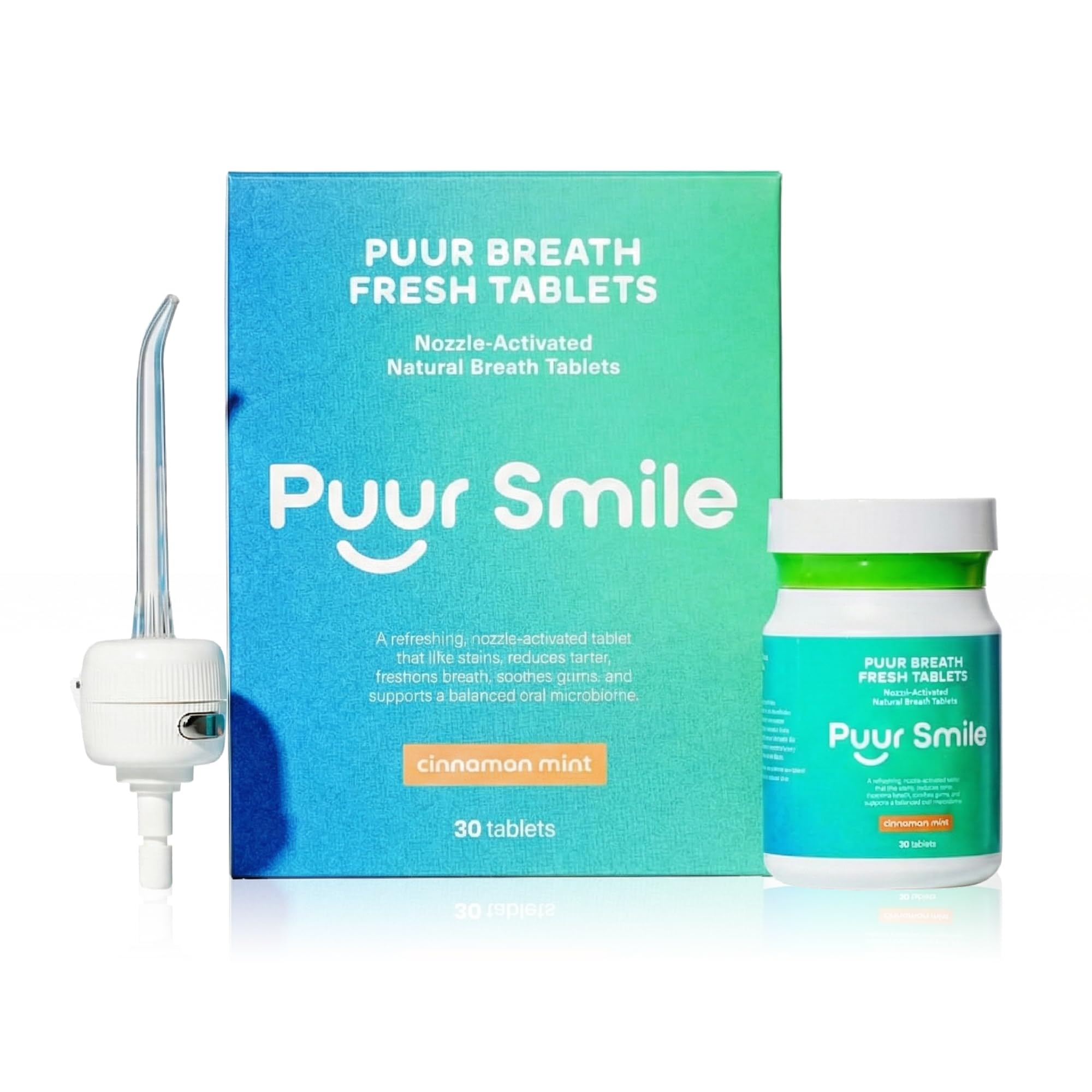 Puur Smile Breath Fresh Tablets with Nozzle Refreshing Nozzle Attached Water Flosser Activated Oral Care Tablets for Fresh Breath & Cleaning Cinnamon Mint Flavor (30 Count)