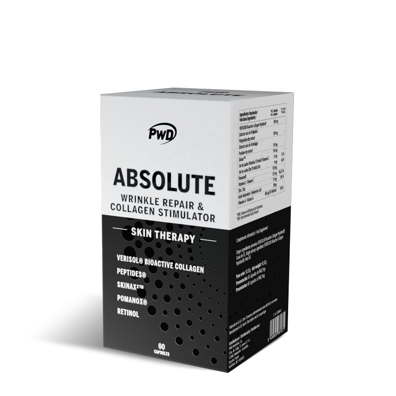 Absolute is a complex designed for healthy, beautiful skin. It helps combat aging and induces the formation of collagen, elastin, and fibrin. It fights problems related to skin pigmentation. It helps improve microcirculation, melanin synthesis, and collagen stability and synthesis. It acts against facial spots and dark circles. It helps revitalize the skin, refines imperfections, adds radiance, and helps even out skin tone. It has a preventative photoprotective action against photoaging by helping to avoid pigmentary disorders, photosensitivity, and atopic dermatitis. It induces the production of collagen, fibrin, and elastin. It helps reduce the depth of even the deepest wrinkles and diminish superficial wrinkles by inducing collagen production. It helps stimulate and stabilize collagen production in both the superficial and deep layers of the skin. To achieve this, Absolute combines 500,000 IU g. Retinol works most effectively from within. Purslane, polypody, and Skinax² help gradually reduce the depth of wrinkles under and around the eyes. It contains Verisol, bioactive collagen peptides that achieve excellent results with just 500 mg. It aids in the synthesis of important components of the dermal matrix, including up to 65 type I collagen, elastin, and fibrin. It provides photoprotective action, preventing the appearance of spots, pigmentation changes, and the loss of collagen and hyaluronic acid due to sun exposure. It contributes to sun protection from the deeper layers of the skin, helping to prevent the appearance of wrinkles and spots, and contributing to maintaining skin health from within while promoting tanning. Polypody contributes to an antimutagenic action, reducing the risk of changes in skin cells. Helps combat skin pigmentation disorders such as melanogenesis. This refers to the alteration of melanocytes, which can lead to both hypopigmentation and hyperpigmentation. The combination of Pomanox, Skinax², and a high concentration of retinol can reduce melanogenesis by up to 50 . Helps with facial spots and regulates melanin synthesis. The high concentration of retinol helps even out skin tone by combating depigmentation. Absolute's microcirculation-activating action combines Skinax² and retinol, which work synergistically to activate cutaneous microcirculation, helping to reduce dark circles under the eyes. It helps reduce both color and texture and activates microcirculation. It also improves tissue irrigation, giving a more radiant and luminous appearance, as well as enhancing tissue regeneration. Anti-inflammatory action for sunburn and aggressive treatments, hypoallergenic and regenerative. Helps block irritants and acts hypoallergenically, helping to reduce potential skin allergies or acne reactions. Purslane and zinc help counteract skin inflammation, even if it results from aggressive dermatological or cosmetic medical treatments that can cause inflammation or irritation. Anti-inflammatory action against common or sunburns and aids in skin regeneration in such cases. Contributes to the improvement of psoriasis. INGREDIENTS Verisol Bioactive Collagen Peptides (Bioactive Hydrolyzed Bovine Collagen Peptides), Polypodium 10:1 Dry Extract (Polypodium leucatomos Poir, root), Coating Agent (Hydroxypropylmethylcellulose) , Skinax² [Grape (Vitis vinifera L. seed, 70 Polyphenols). SOD 210 IU g (bioactive superoxide dismutase (Cucumis melo L. fruit), zinc citrate and vitamin C (L-ascorbic acid)], dry purslane extract 10:1 (Portulaca ole racea L. aerial parts), Pomanox (dry pomegranate extract, Punica granatum L. fruit, 30 Punicaglandins), vitamin C (L-ascorbic acid), sodium hyaluronate, zinc citrate, anti-caking agent (magnesium salts of fatty acids), vitamin A (retinyl acetate 500,000 IU g) and color (brilliant blue FCF) . Capsule components.Helps protect against allergic reactions or acne breakouts. Helps reduce inflammation during irritating treatments or burns. Helps combat sun aging and environmental exposure. Activates microcirculation to help reduce dark circles. With retinol that works from within. Helps reduce the depth of even the deepest wrinkles and diminish superficial lines. Protects against the loss of collagen and hyaluronic acid. Regenerative action that induces the production of collagen, fibrin, and elastin.PWD Absolute 60 capsulesDESCRIPTION DU PRODUIT DESCRIPTION DU PRODUIT Absolute est un complexe destiné à la santé et à la beauté de la peau. Aide contre le vieillissement, induit la formation de collagène, d'élastine et de fibrine. Combat les problèmes liés à la pigmentation de la peau. Contribue à améliorer sa microcirculation, la synthèse de la mélanine, la stabilité et la synthèse du collagène. Agit contre les taches faciales et les cernes noirs. Contribue à revitaliser la peau, affine les aspérités, apporte de la luminosité et aide à unifier les tons de la peau. Possède une action photoprotectrice préventive contre le photovieillissement en aidant à éviter les troubles pigmentaires, la photosensibilité et la dermatite atopique. Action inductrice de la production de collagène, fibrine et élastine Aide à atténuer la profondeur des rides les plus profondes et à réduire les rides superficielles en induisant la production de collagène. Contribue à stimuler et à stabiliser la production de collagène aussi bien des parties superficielles que profondes de la peau. Pour cela, Absolute combine 500 000 IU g. Le rétinol agit de la manière la plus efficace de l'intérieur. Le pourpier le polypode et le Skinax² aident à réduire progressivement la profondeur des rides sous et autour des yeux. Contient du Verisol, ce sont des peptides de collagène bioactifs qui obtiennent d'excellents résultats avec seulement 500 mg. Il aide à la synthèse de composants importants de la matrice dermique, y compris le collagène de type I jusqu'à 65 , l'élastine et la fibrine. Action photoprotectrice, préventive de l'apparition de t