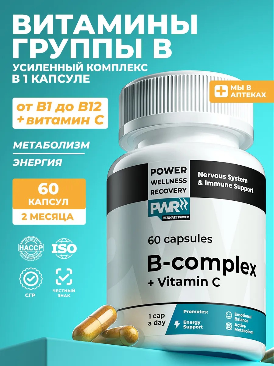 The B Vitamin Complex is a supplement containing everything you need to support your health. This balanced vitamin B complex includes 8 vitamins. Vitamin B1 is essential for the brain and memory in adults. It is responsible for memory, concentration, cognitive function, and stress resistance. Vitamin B1 is involved in the absorption of proteins, carbohydrates, and fatty acids. B2 is involved in nerve cell division, hematopoiesis, hemoglobin synthesis, and helps maintain twilight and peripheral vision, immunity, and healthy skin and mucous membranes. B3, or niacin, is involved in the biosynthesis of hormones (estrogens, progesterone, cortisone, testosterone, insulin, and others), regulates cholesterol levels, affects cerebral circulation, and accelerates the elimination of toxins. B5 is essential for tissue regeneration and blood renewal, helps break down fats and carbohydrates, produces hemoglobin, and improves the structure of skin, hair, nails, and teeth. Vitamin B6 is an antidepressant and has a calming effect. Vitamin B6 is involved in the synthesis of neurotransmitters, including serotonin. Vitamin B7 (biotin) interacts with digestive enzymes, supporting all metabolic processes. Vitamin B9 is essential for the production of white and red blood cells, protein metabolism, and the formation and development of the nervous system and its normal functioning. Vitamin B12 has a positive effect on cognitive abilities. Memory tablets for adults in capsule form are better absorbed than B vitamins in tablet form. We offer multivitamins and amino acids for men, women, children, and teenagers: women's and men's vitamins and amino acids for weight loss, beauty, and health. Active B vitamins from PWR Ultimate Power are comprehensive dietary supplements that are suitable even for pregnant and nursing women. We recommend consulting your doctor before use.