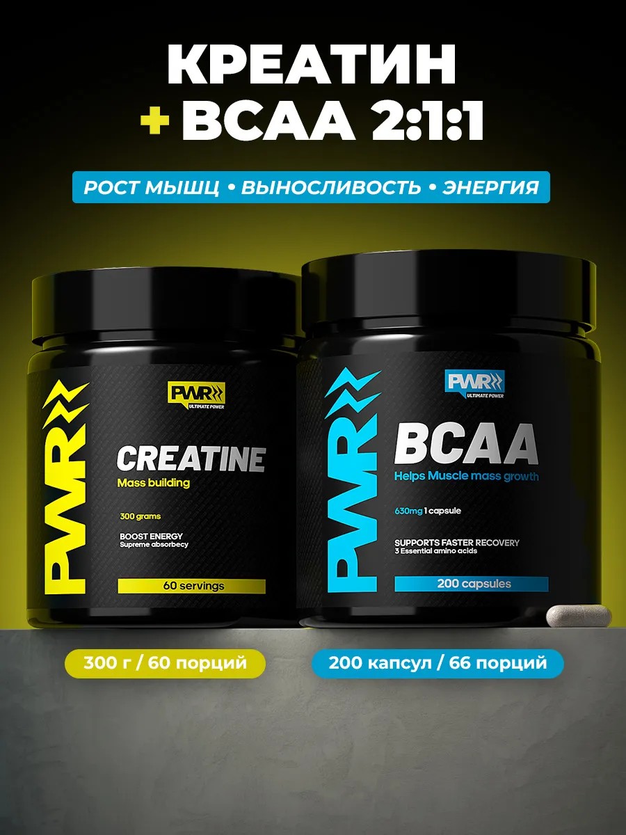 Набор для поддержания формы, сушки и похудения: креатин с нейтральным вкусом и ВСАА 2:1:1 капс. Креатин порошок моногидрат PWR ultimate power – это профессиональное спортивное питание, созданное для роста мышц и увеличения силовых показателей. Creatine monohydrate играет ключевую роль в снабжении мышц энергией. Способствует увеличению запасов креатинфосфата (запаса химической энергии) в мышцах, что позволяет улучшить производительность и выносливость во время интенсивных тренировок. Удерживает воду в клетках, что придает им объем. Спортивное питание BCAA бренда PWR ultimate power – многокомпонентный продукт для рельефного тела и упругих мышц. Аминокислоты L-лейцин, L-изолейцин и L-валин не синтезируются в организме самостоятельно, но важны для наращивания мускулатуры или сохранения уже достигнутого результата. Входящие в состав мышечной ткани вещества восполняются с помощью комплексной пищевой добавки из трех незаменимых аминокислот. Синтезирует мышечный белок и защищает сухую мышечную массу от атрофии.