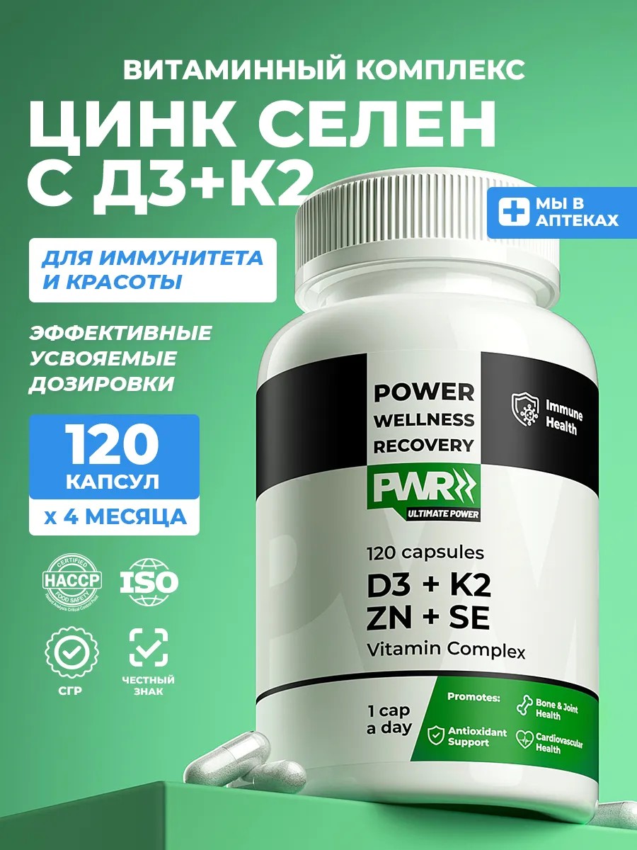 | Комплектация | Витаминный комплекс Д3+К2+Цинк+Селен, 120 капсул |