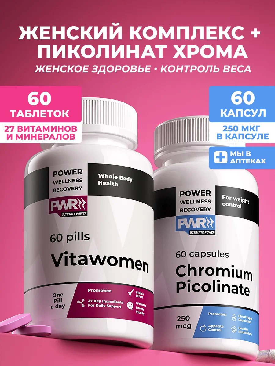 Набор бадов от PWR ultimate power для женского здоровья и стройного тела: комплекс витаминов Vitawomen и пиколинат хрома.
