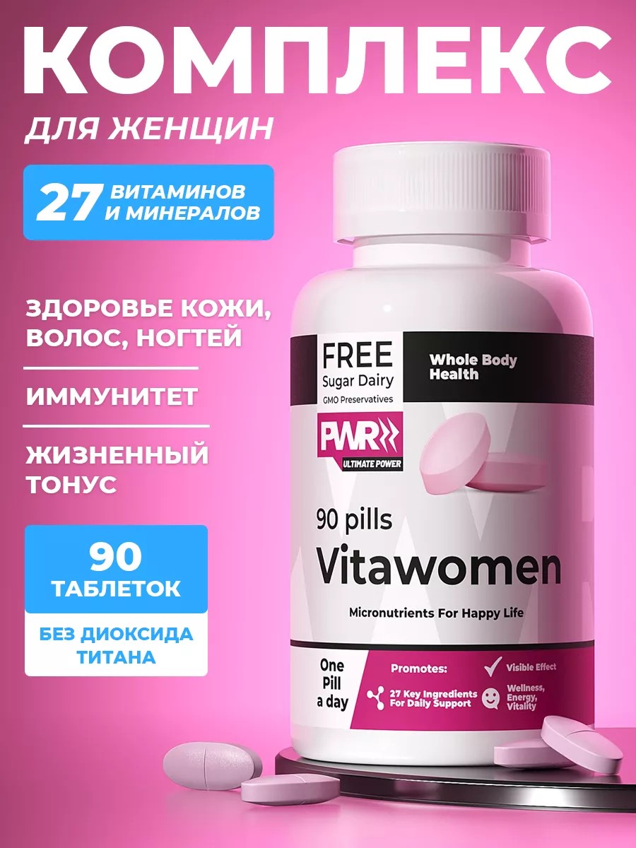 Женские мультивитамины Витавумен women для девушек и женщин – это идеально сбалансированный витаминный и минеральный комплекс для ежедневной поддержки иммунитета и организма. Производитель бадов, витаминов и пищевых добавок для женщин и мужчин PWR ultimate power создал уникальный мультивитаминный комплекс. Это идеальный набор для ногтей, зубов, против выпадения и для роста волос, для похудения. Пользуйтесь нашими витаминами для волос, суставов и связок и будьте уверены, что ваш организм получит все необходимое для поддержания здоровья, красоты и энергии. Витамины в таблетках сочетаются с любым спорт пит спортивным питанием и подходят для беременных, витамины для женщин 40, 50 и 60 плюс. Успокоительное больше не понадобится. Будьте здоровы и красивы с мультивитаминным комплексом для женщин от PWR ultimate power!