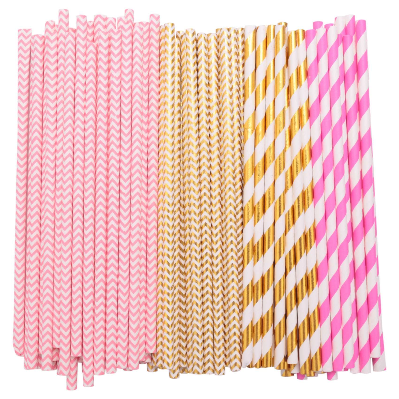 Pzhoais Biodegradable Paper Straws 100 Pink for Party Supplies Birthday Wedding Bridal/Baby Shower Decorations and Holiday Celebrations
