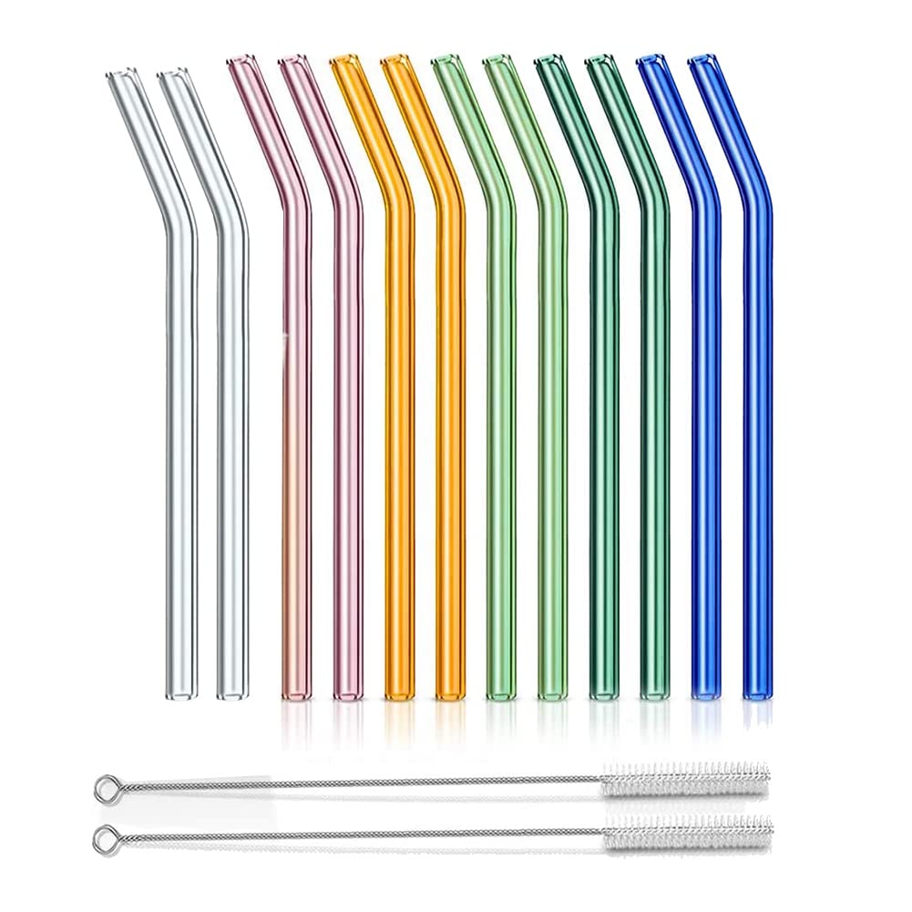 Pzhoais Reusable Glass Straws Bent Glass Drinking Straws with 2 Cleaning Brushes Straws for Smoothies (Multicolor 12 Pack)