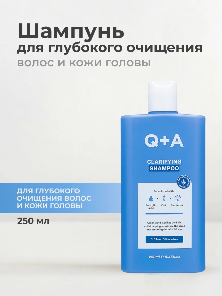 Чистота и баланс в стиле Q+A. Балансирующий шампунь Q+A Clarifying Shampoo создан для глубокого очищения волос и кожи головы. Формула с салициловой кислотой, экстрактом овса и пребиотиками бережно удаляет загрязнения и остатки стайлинговых средств, мягко отшелушивает и восстанавливает баланс, успокаивая чувствительный микробиом кожи головы. Шампунь способствует нормализации микрофлоры, предотвращая такие проблемы, как гиперсекреция сальных желез, перхоть и повышенная чувствительность.