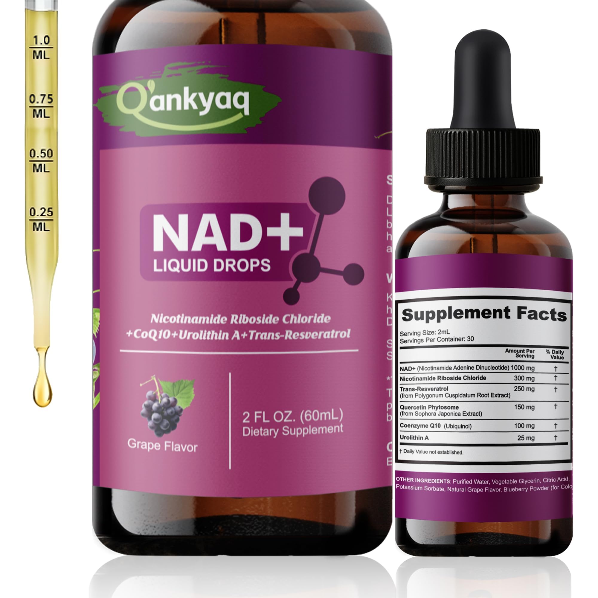 Usage Recommendations: Take once daily, 2mL per serving. Due to the product's thick consistency, it is recommended to mix it into your preferred beverage such as juice, yogurt, or slush. Stir or shake well before use to ensure even distribution of ingredients. For optimal taste and shelf life, refrigerate after opening to maintain ingredient potency. Delicious Convenient Our grape-flavored liquid NAD plus supplement for women is easy to take - just 2 ml per day, either straight or mixed with water or juice. Rapidly absorbed, it dramatically improves energy, concentration and overall well-being!. Immune Support NAD Liquid Supplement for women contains 150mg of quercetin phytosome and 25mg of urolithin A. When combined with NAD, it enhances immunity by boosting mitochondrial, balancing immune, and activating the SIRT1. This elevates overall health and builds a protective shield!. Improved Focus Trans-Resveratrol Nicotinamide Riboside Chloride dual activation of SIRT1 for enhanced plasticity, less forgetfulness and improved concentration. At the same time, urolithin A and quercetin phytosome increase the activity, so that the brain is protected and safeguarded!. Enhanced Bioavailability Nicotinamide Riboside Chloride is a precursor to NAD added to NAD liquid supplement. It effectively boosts NAD levels and conversion efficiency, thereby enhancing nutrient absorption and utilization. Elevate your nutrient absorption potential to new heights!. Promotes Internal Vitality NAD Drops for women contain nad 1000mg and nicotinamide riboside chloride 300mg to provide "fuel" for energy metabolism, while CoQ10, uricetin A, trans-resveratrol, and quercetin enhance internal energy efficiency and sustain long-term energy supply. This ensures that the "internal power plant" produces energy efficiently and sustainably!.