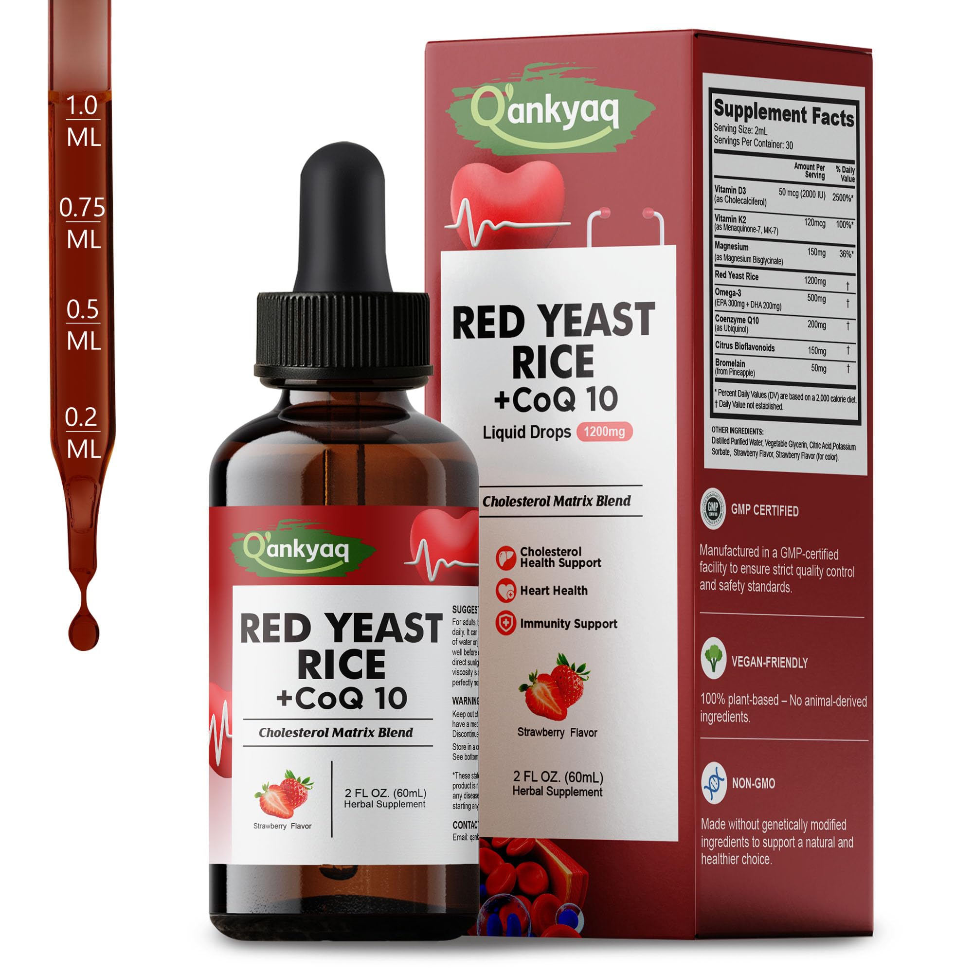 Q'ankyaq Red Yeast Rice with CoQ10 Liquid Drops 1200mg Red Rice Yeast Extract for Cholesterol Health CoQ10 200mg for Heart Support with Omega-3 Citrus Bioflavonoids & Bromelain 2 FL OZ
