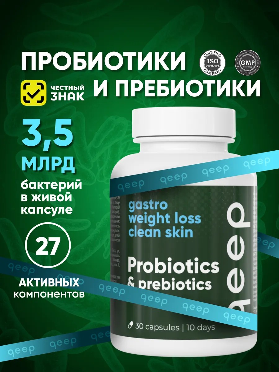 Уникальный комплекс пробиотиков и пребиотиков содержит 3,5 миллиарда полезных бактерий в каждой капсуле. Он произведен брендом QEEP, имеющим множество престижных наград. Пищевая добавка без диоксида титана предназначена для поддержки здоровой микрофлоры кишечника и восстановления баланса. Она используется в качестве добавки к пище как комплексный источник пробиотических бактерий: бифидобактерий, лактобактерий и пропионовокислых бактерий. Они крайне важны для полноценного функционирования организма взрослых людей. В составе содержится 27 активных компонентов. Формула включает стеарат кальция и глицерин, концентрат комбуча и массу других полезных веществ для поддержания работы пищеварительной системы. Препарат эффективно справляется с укреплением организма и повышением иммунитета. Он способствует снижению уровня патогенных микроорганизмов, способных привести к возникновению дискомфорта в животе. При этом стимулируется рост полезных бактерий и отмечается улучшение пищеварения, состояния волос и кожи. Добавка помогает при нарушениях микрофлоры кишечника и метаболизма на фоне приема антибиотиков и антипаразитарных средств. Она также будет полезна в борьбе против лишнего веса. Во время приема нормализуется стул и усиливается защита от патогенных бактерий, обеспечивается максимальное усвоение витаминов и минералов при похудении. При этом в животе отмечается ощущение легкости и комфорта. Препарат предназначен для приема взрослыми женщинами и мужчинами. Применение по 1 капсуле во время еды 1-3 раза в день осуществляется курсом продолжительностью 1 месяц. От использования средства следует отказаться при индивидуальной непереносимости входящих в состав компонентов, при кормлении грудью и беременности. Перед началом применения средства рекомендуется проконсультироваться с врачом. Этот препарат предложен также в наборе из двух баночек. Помимо этого, в нашей коллекции представлено множество других добавок к питанию. Есть средства на основе женьшеня или расторопши. Предложен жидкий хлорофилл. Есть ряд других биодобавок с тщательно подобранным составом. Среди такого многообразия не составит труда подобрать подходящий вариант, исходя из преследуемых целей и состояния организма. У нас есть акции и распродажи, вы можете купить наши товары в подарок со скидкой!