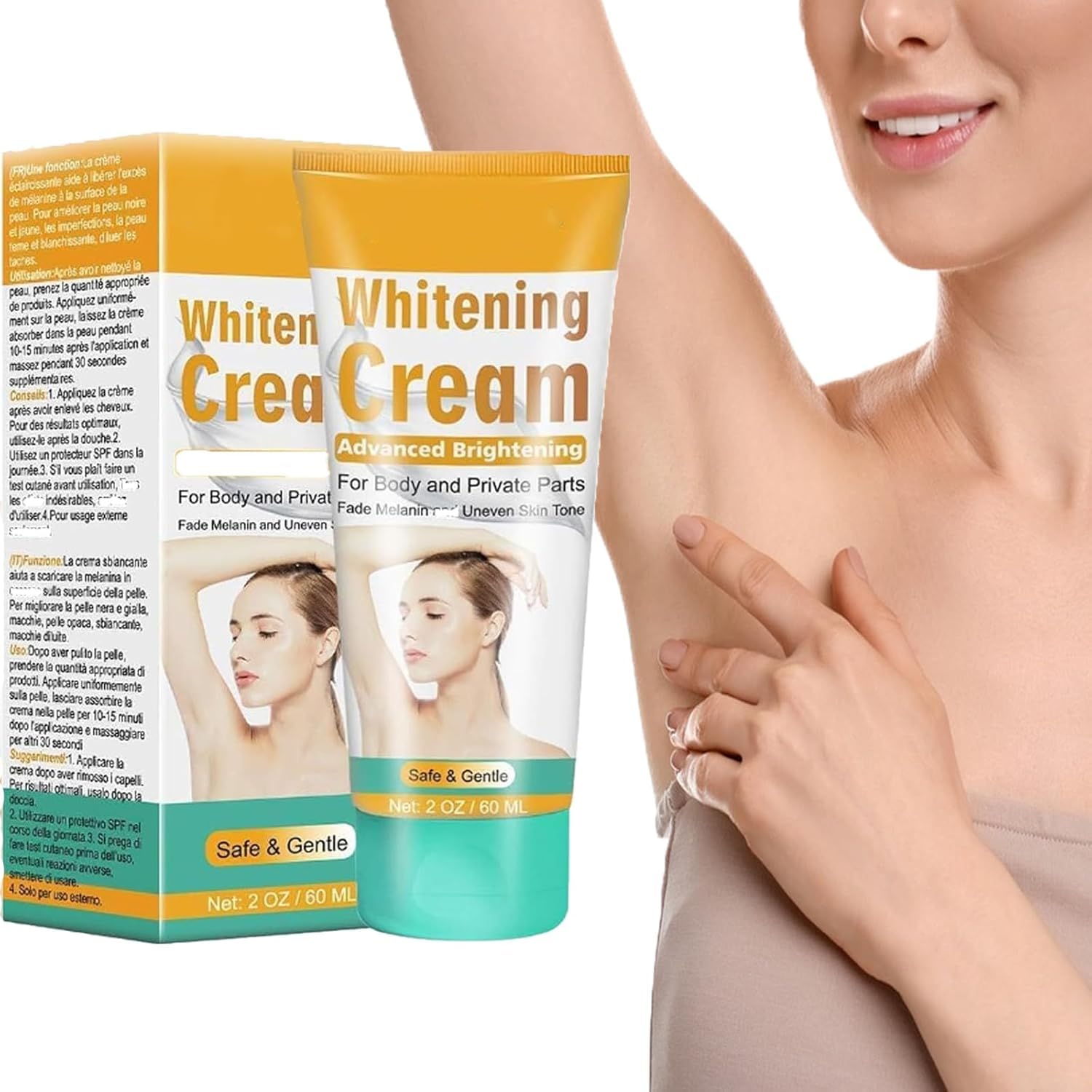 Discover our brightening cream specially formulated for sensitive areas of the body. This innovative 60ml skincare product is particularly effective for underarms, elbows, and other delicate areas that require extra care. The gentle yet effective formula helps even out skin tone while moisturizing. Ideal for daily use, this cream absorbs quickly without leaving a greasy residue. For best results, apply the cream to clean, dry skin, massaging gently until fully absorbed. The light, non-sticky texture ensures optimal comfort throughout the day. This versatile moisturizer fits perfectly into your daily skincare routine for more even and radiant skin. SAFETY WARNING noDAILY USE: Apply morning and evening to targeted areas for gradual, natural-looking results. AREAS OF USE: Ideal for underarms, elbows, knees, and other sensitive areas requiring lightening. EASY APPLICATION: Creamy texture that absorbs quickly into the skin without leaving a greasy residue. GENEROUS SIZE: Convenient 60ml bottle provides several weeks of daily use. LIGHTENING FORMULA: Cream specially designed to naturally lighten sensitive areas such as underarms, elbows, and intimate areas.Underarm Whitening Cream, Crème Blanchissante, 60ML Whitening Cream, Crème éclaircissante pour Aisselles, Efficace pour les aisselles, Les Coudes, Les Zones Sensibles Et PrivéesDESCRIPTION DU PRODUIT DESCRIPTION DU PRODUIT Découvrez notre crème éclaircissante spécialement conçue pour les zones sensibles du corps. Ce produit de soin innovant de 60 ml est particulièrement efficace pour les aisselles, les coudes et autres zones délicates qui nécessitent une attention particulière. La formule douce mais efficace aide à uniformiser le teint de la peau tout en l'hydratant. Idéale pour une utilisation quotidienne, cette crème pénètre rapidement sans laisser de sensation grasse. Pour de meilleurs résultats, appliquez la crème sur une peau propre et sèche en massant délicatement jusqu'à absorption complète. La texture légère et non collante permet un confort optimal tout au long de la journée. Cette crème hydratante polyvalente s'intègre parfaitement dans votre routine de soin quotidienne pour une peau plus uniforme et éclatante. AVERTISSEMENT DE SÉCURITÉ noUTILISATION QUOTIDIENNE: S'applique matin et soir sur les zones ciblées pour des résultats progressifs et naturels. ZONES D'UTILISATION: Idéale pour les aisselles, les coudes, les genoux et autres zones sensibles nécessitant un éclaircissement. APPLICATION FACILE: Texture crémeuse qui pénètre rapidement dans la peau sans laisser de résidus gras. CONTENANCE GÉNÉREUSE: Flacon pratique de 60 ml permettant plusieurs semaines d'utilisation quotidienne. FORMULE ÉCLAIRCISSANTE: Crème spécialement conçue pour éclaircir naturellement les zones sensibles comme les aisselles, les coudes et les zones intimes.