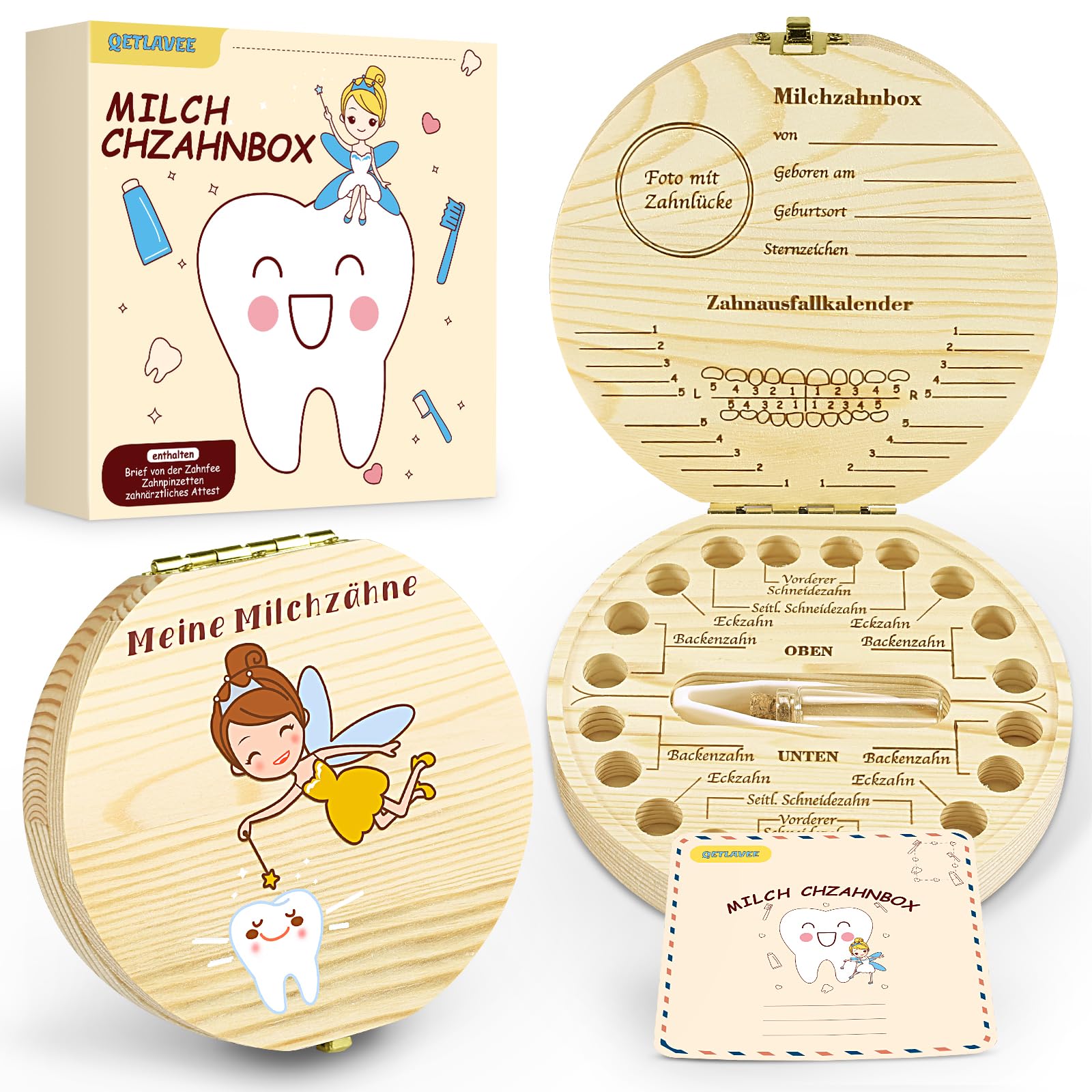 ?Nice gift? Every tooth has its own room with label in German in this elaborately designed milk tooth box.In addition to storage from the milk teeth, this box can also be a memorial gift, whether they are invited to visit or organize the baptism of children, the milk tooth box is always happy to be accepted as a gift.It is suitable as a perfect gift for Christmas, Easter, birthdays.?Wood tooth box set? The milk tooth box set is fully equipped, contains tweezers, a desired bottle and a cotton ball.To store it safely, the individual milk tooth can be placed in the attached cotton (with the cotton cotton wool, which is water -absorbing and holding dry, the teeth can be stored more safely), then put tweezers into the corresponding groove.Tips: Please your teeth before using the box and keep it dry.?Unique design? This wood-toothing box consists of two wooden elements, is fixed together by hinge switches, the surface is heart-shaped, has a built-in transparent board (note: there is a white film on the board, you can tear it off before use),There are independent grooves within the box, in which you can keep milk teeth, the wood-toothing box has the color of the raw wood, you can also make the color you like (DIY).?Esing important moments? The wood-toothing box is used to commemorate the fallen milk teeth, every lost tooth is unique that should be dated accordingly.Inside, photos can be placed, and the name, birthday, place of birth, constellation and date of the tooth loss are marked, this is an unforgettable memory that is worth taking up, it becomes an imperishable souvenir.???? ?Material? This milk tooth box is made of raw wood, it is robust and durable, with smooth and ridge -free surface, can protect your skin from damage and be used safely.?Schönes Geschenk?Jeder Zahn hat eigenen Raum mit Label auf Deutsch in dieser aufwendig gestalteten Milchzahnbox. Neben Lagerung von der Milchzähne, diese Box kann auch ein Gedenkgeschenk sein, Ob Sie eingeladen sind, die Kindertaufe zu besuchen oder zu veranstalten, wird die Milchzahnbox als ein Geschenk immer gerne angenommen. Sie ist geeignet als ein perfektes Geschenk für Weihnachten, Ostern, Geburtstagen. ?Holz-Zahnbox-Set?Das Milchzahnbox-Set ist komplett ausgestattet, enthält eine Pinzette, eine Wunschflasche und einen Wattebausch. Zur sicher Aufbewahrung können der einzelne Milchzahn in die angebrachte Watte gelegt werden (mit der Baumwollwatte, die wasseranziehend und haltend trocken ist, kann die Zähne sicherer gelagert werden), setzen Sie dann die Pinzette in die entsprechende nut. Tipps:Sie bitte die Zähne vor Gebrauch der Box und halten sie trocken. ?Einzigartiges Design?Diese Holz-Zahnbox besteht aus zwei Holzelementen, wird durch Scharnierschalter zusammen fixiert, die Oberfläche ist herzförmig, besitzt eine eingebautes transparentes Brett (Anmerkung: Auf dem Brett gibt es einen weißen Film, vor dem Gebrauchen können Sie diesen abreißen), innerhalb der Box gibt es unabhängige Nuten, darin kann man Milchzähne aufbewahren, Die Holz-Zahnbox hat die Farbe vom Rohholz, Sie können auch die Farbe selber machen, die Sie mögen (DIY). ?Wichtige Momente aufzeichnen?Die Holz-Zahnbox wird verwendet, um die gefallenen Milchzähne zu gedenken, Jeder verlorene Zahn ist einzigartig, der entsprechend datiert werden sollte. Drinnen können Fotos platziert werden, und Name, Geburstag, Geburtsort, Sternbild und Datum des Zahnverlustes markiert werden, dies ist eine unvergessliche Erinnerung, die wert ist, aufzunehmen, sie wird ein unvergängliches Souvenir. ?????Material?Diese Milchzahnbox wird aus Rohholz hergestellt, sie ist robust und langlebig, mit glatter und gratfreier Oberfläche, kann Ihre Haut vor Schäden schützen und sicher verwendet werden.Qetlavee Zahndose Holz,Milchzahndose,Zahnbox Holz Milchzähne Box mit Pinzette&Wunschflasche,Aufbewahrungsbox für Kinder Zähne,Erinnerungsboxen für Babys(Zahnfee-2)