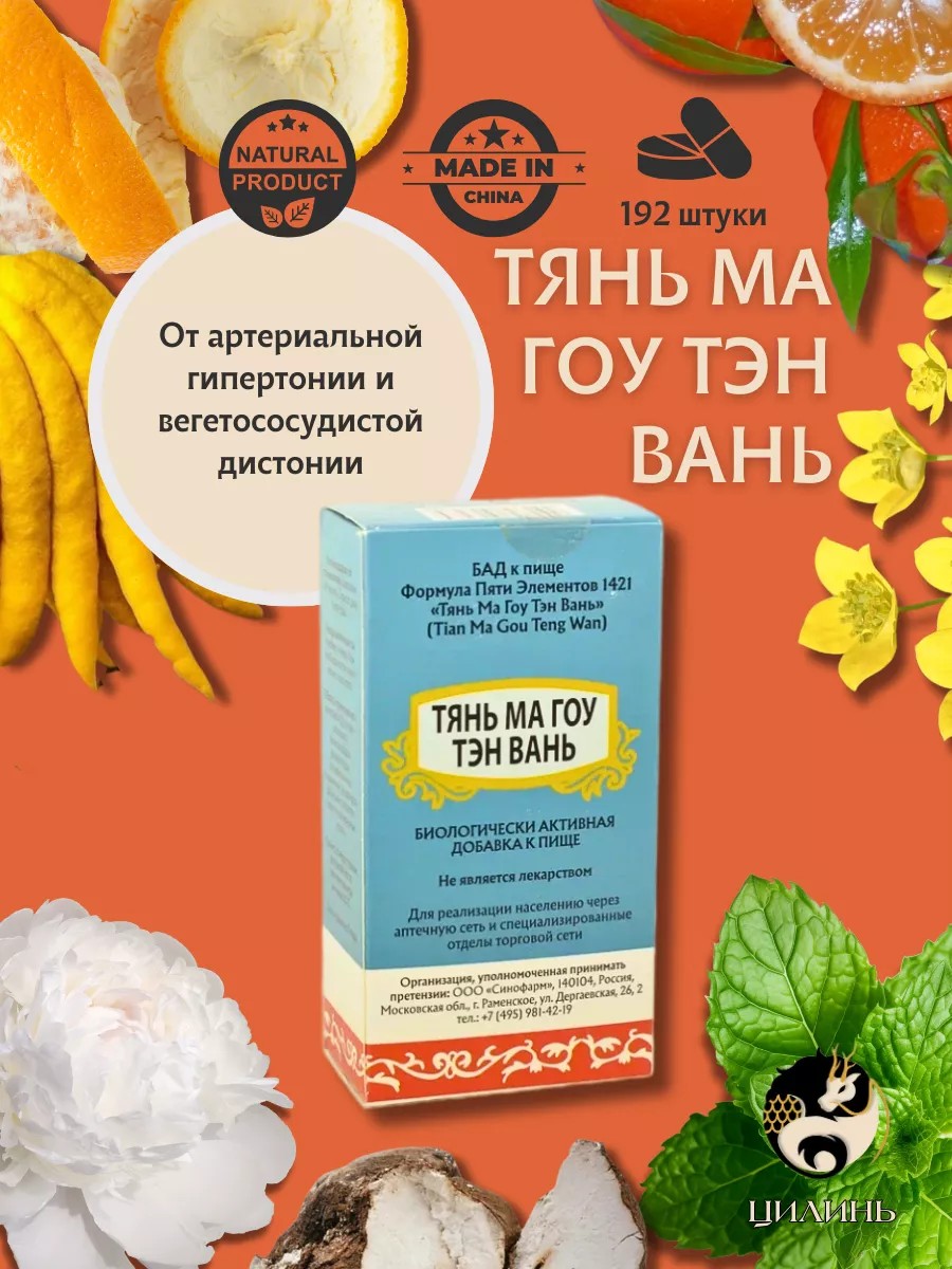 | Trade name | biologically active food supplement "Five Elements Formula 1421 "Tian Ma Gou Teng Wan" ("Tian Ma Gou Teng Wan") (pills weighing 0.18 g) |