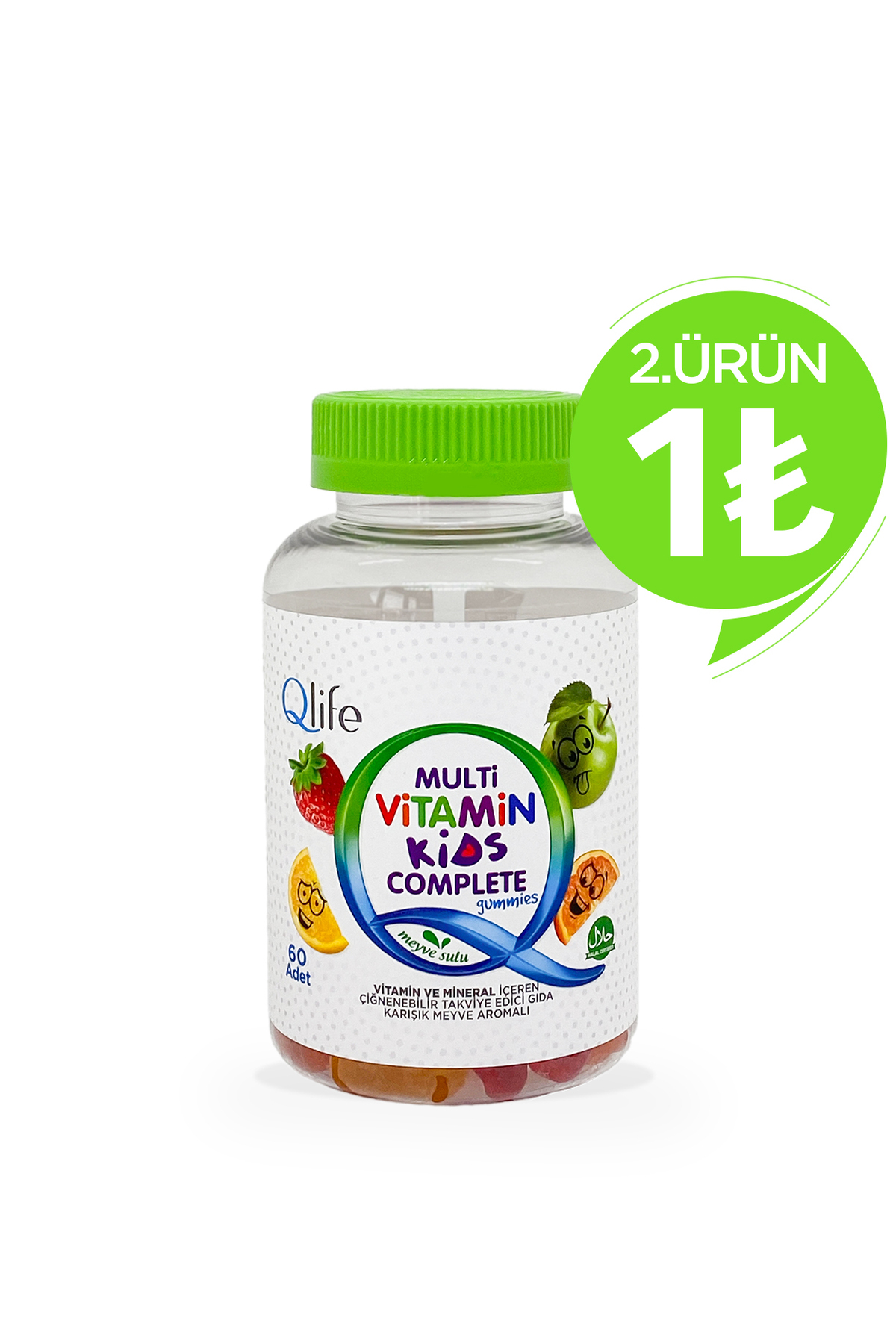 • Çocuklarin günlük almalari gerekenvitaminve mineralleri kompleks halde içeren Qlife KidsMultivitaminComplete Gummies, çignenebilir jel formu ve dogal karisik meyve aromasi ile lezzetli ve keyifli bir deneyim sunar. Kapsül yutmakta zorlanan yetiskinler ve çocuklar için ideal bir vitamin olan Qlife Kids Multivitamin Complete Gummies 4 yas üzeri tüm aile bireyleri tarafindan kullanilabilir.