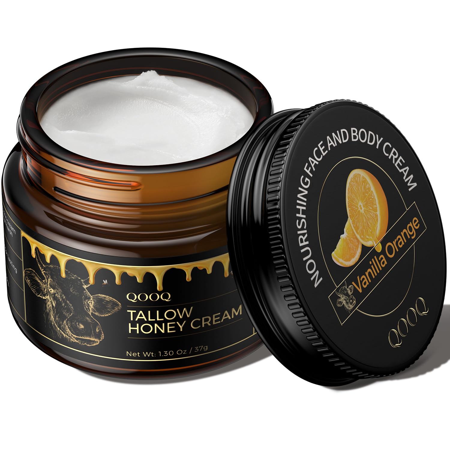 QOOQ 100% Grass Fed Beef Tallow for Skin with Raw Honey & Beach Rose Oil - for Sensitive & Eczema Skin - Natural Face/Body Butter + Lip Balm Orange 1.3 oz