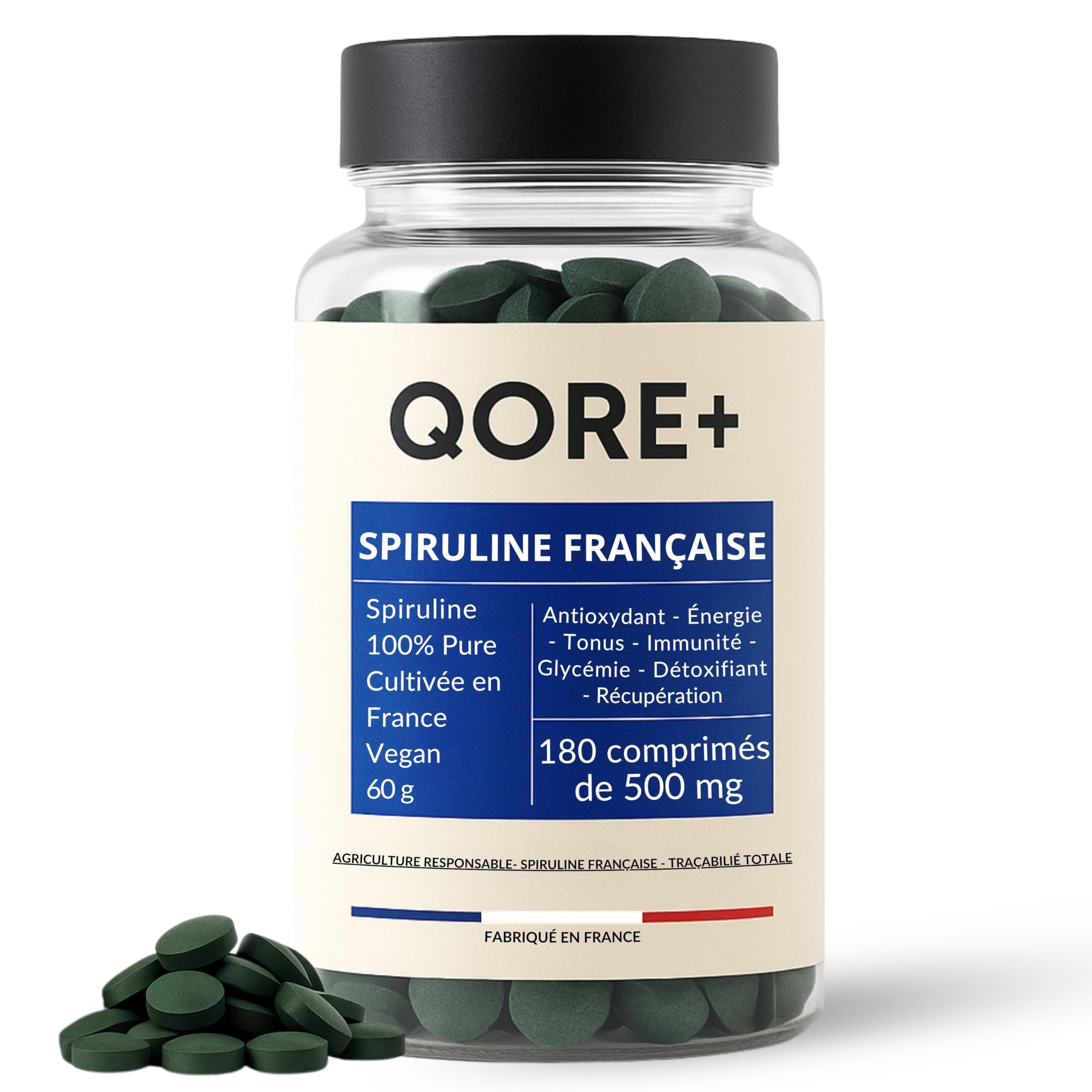 QORE+ French Spirulina Tablets 90 g High Nutritional Density Grown in Provence Energy Immunity Recovery 100% Vegan