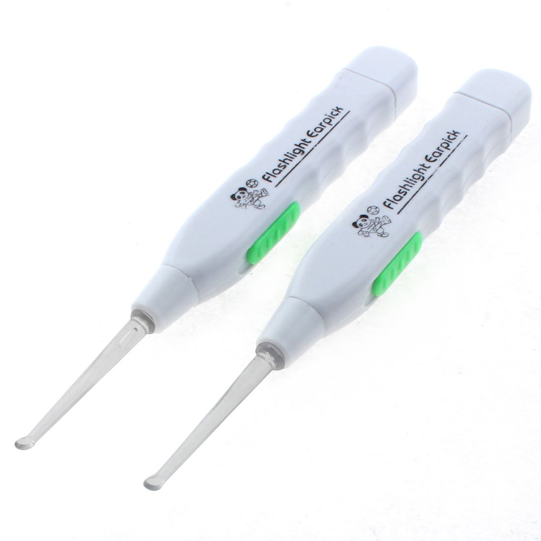 Ear Wax Flashlight Remover Cleaner Curette Spoon Earpick 2pcs White Switch on before use. The spoon part illuminates to facilitate inspecting the inside of an ear. Two types of ear picks, i.e. thick and thin. The tweezer is equipped to catch big earwax. Light on the ear pick should be turned off after using. If it is not used for a long period, take out the battery in case battery leakage damaging the product. Attention: Please use it with EXTRA CARE as it may have the potential to the ear drum while improper using.