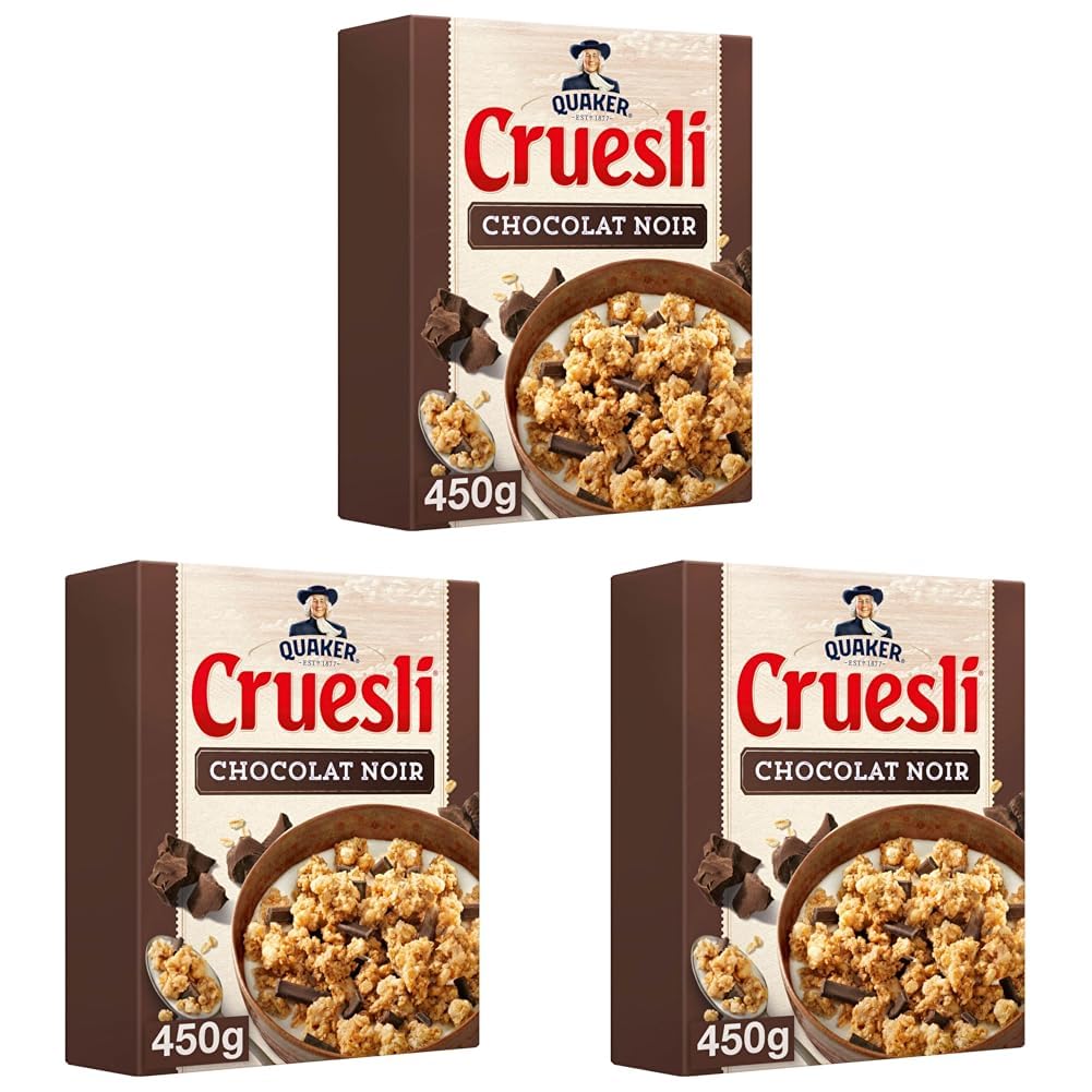 : Quaker, the oat expert for 140 years. In 1877, two farmers joined forces to produce high-quality wholegrain oats from a small mill in Ohio. Quaker became the world's first commercially available cereal brand. Since then, we have maintained the same meticulous care in selecting our wholegrain grains and minimizing processing to preserve their nutritional value and authentic taste. All this so that every morning you can awaken your taste buds with Quaker Cruesli : crunchy clusters of wholegrain oats and wheat, delicately toasted in the oven generous chunks of fine, melting chocolate or a mix of crunchy nuts—choose your favorite for a delicious breakfast for the whole family. Quaker Cruesli is a natural source of fiber, vitamin B1, iron, and phosphorus to help you start your day right. Always preservative-free. Ingredients: Wholegrain Oats (37 ), Dark Chocolate (12 ) [cocoa mass, sugar, natural vanilla flavoring, emulsifiers (SOY lecithin, polyglycerol polyricinoleate)], sunflower oil, sugar, wholegrain Wheat (9.6 ), glucose syrup, oligofructose (chicory root extract), rice flour, wheat flour, desiccated coconut, molasses, salt, cinnamon, natural apple caramel flavoring and other natural flavorings, antioxidant (tocopherol). Dark chocolate contains a minimum of 65 cocoa. May contain milk and various types of nuts. Instructions: Pour milk or your preferred beverage into a bowl. Add the cereal and enjoy. See moreQUAKER, THE OAT EXPERT FOR OVER 140 YEARS: In 1877, two American farmers joined forces to produce premium wholegrain oats from a small mill in Ohio. Quaker quickly became the world's leading cereal brand. DISCOVER THE DIVERSITY OF OUR RANGE: Quaker also offers three other ranges to suit every taste: Quaker Oats (oat flakes), Quaker Muesli (a blend of oats, wheat flakes, and barley), and Quaker Super Goodness Vitality (a blend of oats, barley, and quinoa). CEREALS TO VARY YOUR FUN: Quaker Cruesli cereals can be enjoyed on their own, with fruit juice, a bowl of milk, fresh fruit, or dried fruit. These cereals are also perfect for recipes such as granola, cereal bars, dessert cups, etc. WHOLE GRAIN CEREALS FOR A COMPLETE AND HEALTHY BREAKFAST: Quaker cereals are a natural source of fiber, vitamin B1, magnesium, and phosphorus to help you start your day right. Quaker is the essential brand for a delicious breakfast for the whole family! Quaker offers exclusively preservative-free and palm oil-free cereals. QUAKER CRUESLI, CRUNCHY, GOURMET, AND DELICIOUS: Quaker Cruesli Dark Chocolate features crunchy whole grain oat and wheat nuggets, delicately oven-baked to a golden brown, combined with delicious, high-quality ingredients (Belgian dark chocolate, hazelnut, etc.). The information below applies to each unit in the pack.Description du produit Quaker, l'expert de l'avoine depuis 140 ans. C'est en 1877 que deux fermiers s'associent pour produire de l'avoine complète de haute qualité, depuis un petit moulin situé dans l'Ohio. Quaker devient alors la première marque de céréales commercialisée au monde. Depuis, nous veillons toujours avec la même attention à la sélection de nos céréales complètes et à leur faible transformation, pour en préserver leurs qualités nutritionnelles et leur goût authentique. Tout ça, pour que chaque matin vous puissiez réveiller vos papilles avec Quaker Cruesli : des pépites croquantes de flocons d'avoine et de blé complets délicatement dorées au four, de généreux morceaux de chocolat fins et fondants ou encore un mélange de noix croquantes, choisissez votre recette favorite pour un petit-déjeuner savoureux pour toute la famille. Quaker Cruesli est naturellement source de fibres, vitamine B1, fer et phosphore pour bien démarrer la journée. Toujours sans conservateurs. Ingrédients AVOINE complète (37 ), chocolat noir (12 ) [pâte de cacao, sucre, arôme naturel de vanille, émulsifiants (lécithine de SOJA, polyglycerol polyricinoléate)],huile de tournesol,sucre,BLÉ complet (9,6 ),sirop de glucose,oligofructose (extrait de racine de chicorée),farine de riz,farine de BLÉ,noix de coco séchée,mélasse,sel,cannelle,arôme naturel de caramel aux pommes et autres arômes naturels,antioxydant (tocophérol), le chocolat noir contient 65 de cacao minimum. Peut contenir du lait et différents types de fruits à coque. P.when('A').execute(function(A) { A.on('a:expander:toggle_description:toggle:collapse', function(data) { window.scroll(0, data.expander. expander[0].offsetTop-100) }) }) Mode d'emploi Verser le lait ou une boisson de votre choix dans un bol. Ajouter les céréales et déguster. Voir plusQUAKER, L'EXPERT DE L'AVOINE DEPUIS PLUS DE 140 ANS : C'est en 1877 que deux fermiers d'origine américaine s'associent pour produire de l'avoine complète de qualité supérieure, depuis un petit moulin situé dans l'Ohio. Quaker devient alors la première marque de céréales au monde. DÉCOUVREZ AUSSI LA DIVERSITÉ DE NOTRE GAMME : Quaker, c'est aussi 3 autres gammes pour toutes les envies, avec Quaker Oats (flocons d'avoine), Quaker Muesli (mélange d'avoine, pétales de blé, et d'orge), et Quaker Super Goodness Vitalité (mélange d'avoine, d'orge, et de quinoa). DES CÉRÉALES POUR VARIER LES PLAISIRS : Les céréales Quaker Cruesli peuvent se déguster seules, avec une boisson de type jus de fruits, un bol de lait, des fruits frais ou de fruits secs. Ces céréales conviennent aussi parfaitement pour des recettes de cuisine comme des granolas, des barres de céréales, des verrines de desserts, . DES CÉRÉALES COMPLÈTES POUR UN PETIT-DÉJEUNER COMPLET ET SAIN : Les céréales Quaker sont naturellement source de fibres, vitamines B1, magnésium, et phosphore pour bien démarrer la journée. Quaker est la marque incontournable pour un petit-déjeuner savoureux pour toute la famille ! Quaker propose exclusivement des céréales sans conservateurs et sans huile de palme. QUAKER CRUESLI, DES PÉPITES CROQUANTES, GOURMANDES, ET DÉLICIEU