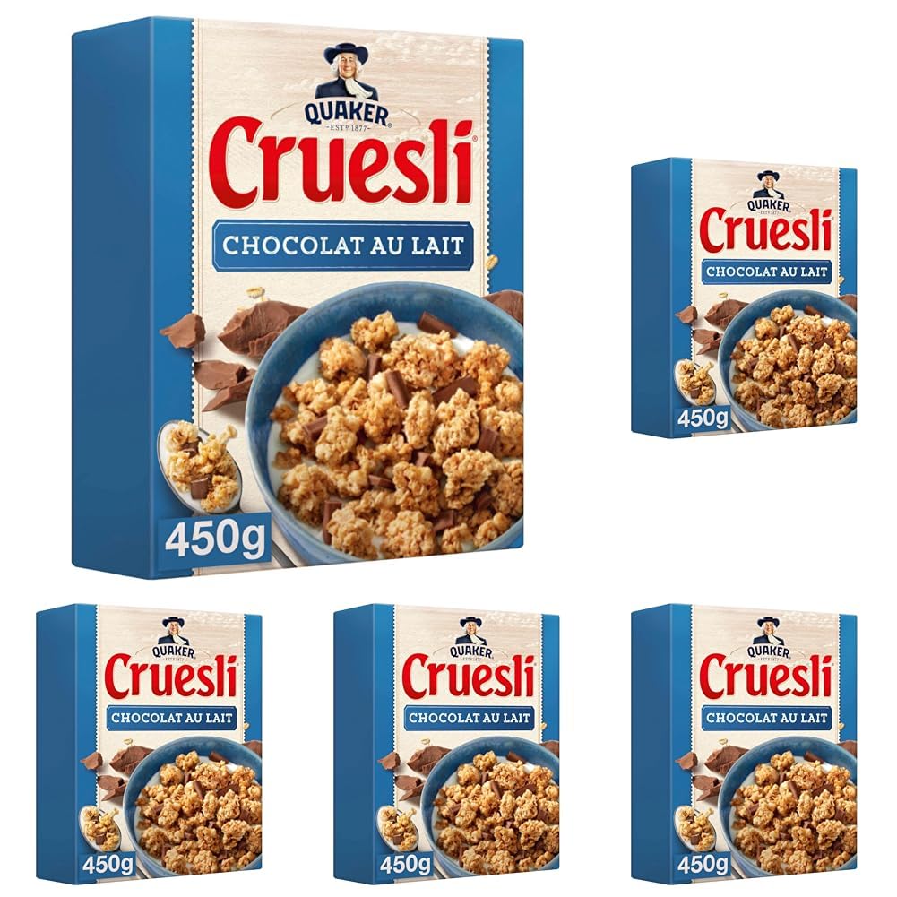 Ingredients: Wholegrain Oats (37 ), Milk Chocolate (13 ) [sugar, Milk Powder, Cocoa Mass, Cocoa Butter, Emulsifier (Soy Lecithin)], Sunflower Oil, Sugar, Wholegrain Wheat (9 ), Glucose Syrup, Oligofructose, Rice Flour, Wheat Flour, Coconut, Molasses, Salt, Natural Apple Caramel Flavoring and Other Natural Flavoring, Antioxidant (Tocopherol). Milk chocolate contains a minimum of 30 cocoa. Instructions: Add milk or water to the cereal. P.when('A').execute(function(A) { A.on('a:expander:toggle_description:toggle:collapse', function(data) { window.scroll(0, data.expander. expander[0].offsetTop-100) }) }) Disclaimer: Image is for illustrative purposes only. The information above is provided for informational purposes only. It is not necessarily exhaustive and should not replace the information on the product packaging, which is the only authoritative source and to which you should refer, particularly in case of food intolerance. See moreQUAKER, THE OAT EXPERT FOR OVER 140 YEARS: In 1877, two American farmers joined forces to produce premium wholegrain oats from a small mill in Ohio. Quaker quickly became the world's leading cereal brand. DISCOVER THE DIVERSITY OF OUR RANGE: Quaker also offers three other ranges to suit every taste: Quaker Oats (oat flakes), Quaker Muesli (a blend of oats, wheat flakes, and barley), and Quaker Super Goodness Vitality (a blend of oats, barley, and quinoa). CEREALS TO VARY YOUR FUN: Quaker Cruesli cereals can be enjoyed on their own, with fruit juice, a bowl of milk, fresh fruit, or dried fruit. These cereals are also perfect for recipes such as granola, cereal bars, dessert cups, etc. WHOLE GRAINS FOR A COMPLETE AND HEALTHY BREAKFAST: Quaker cereals are a natural source of fiber, vitamin B1, magnesium, and phosphorus to help you start your day right. Quaker is the essential brand for a delicious breakfast for the whole family! Quaker offers exclusively preservative-free and palm oil-free cereals. QUAKER CRUESLI, CRUNCHY, GOURMET, AND DELICIOUS: Quaker Cruesli Milk Chocolate features crunchy whole grain oat and wheat nuggets, delicately oven-baked to a golden brown, combined with delicious, high-quality ingredients (generous chunks of thin, melting Belgian milk chocolate). The information below applies to each unit in the pack.Ingrédients AVOINE complète (37 ),chocolat au lait (13 ) [sucre, LAIT en poudre, pâte de cacao, beurre de cacao, émulsifiant (lécithine de SOJA)],huile de tournesol,sucre,BLÉ complet (9 ),sirop de glucose,oligofructose,farine de riz,farine de BLÉ,noix de coco,mélasse,sel,arôme naturel de caramel aux pommes et autre arôme naturel,antioxydant (tocophérol), Le chocolat au lait contient 30 de cacao minimum. Mode d'emploi Ajouter du lait ou de l'eau aux céréales. P.when('A').execute(function(A) { A.on('a:expander:toggle_description:toggle:collapse', function(data) { window.scroll(0, data.expander. expander[0].offsetTop-100) }) }) Clause de non-garantie Photographie non contractuelle. Les indications ci-dessus sont données à titre d'information. Elles ne sont pas forcément exhaustives et ne sauraient se substituer aux informations figurant sur l'emballage du produit qui font seules foi, et auxquelles vous êtes invités à vous reporter, notamment en cas d'intolérance alimentaire. Voir plusQUAKER, L'EXPERT DE L'AVOINE DEPUIS PLUS DE 140 ANS : C'est en 1877 que deux fermiers d'origine américaine s'associent pour produire de l'avoine complète de qualité supérieure, depuis un petit moulin situé dans l'Ohio. Quaker devient alors la première marque de céréales au monde. DÉCOUVREZ AUSSI LA DIVERSITÉ DE NOTRE GAMME : Quaker, c'est aussi 3 autres gammes pour toutes les envies, avec Quaker Oats (flocons d'avoine), Quaker Muesli (mélange d'avoine, pétales de blé, et d'orge), et Quaker Super Goodness Vitalité (mélange d'avoine, d'orge, et de quinoa). DES CÉRÉALES POUR VARIER LES PLAISIRS : Les céréales Quaker Cruesli peuvent se déguster seules, avec une boisson de type jus de fruits, un bol de lait, des fruits frais ou de fruits secs. Ces céréales conviennent aussi parfaitement pour des recettes de cuisine comme des granolas, des barres de céréales, des verrines de desserts, . DES CÉRÉALES COMPLÈTES POUR UN PETIT-DÉJEUNER COMPLET ET SAIN : Les céréales Quaker sont naturellement source de fibres, vitamines B1, magnésium, et phosphore pour bien démarrer la journée. Quaker est la marque incontournable pour un petit-déjeuner savoureux pour toute la famille ! Quaker propose exclusivement des céréales sans conservateurs et sans huile de palme. QUAKER CRUESLI, DES PÉPITES CROQUANTES, GOURMANDES, ET DÉLICIEUSES : Quaker Cruesli Chocolat au Lait, ce sont des pépites croquantes d'avoine et blé complets délicatement dorées au four, associés à de délicieux ingrédients de qualité (généreux morceaux de chocolat au lait belge fins et fondants). Les informations ci-dessous s'appliquent à chaque unité du pack.Quaker Cruesli Chocolat au Lait 450 g (Lot de 5)