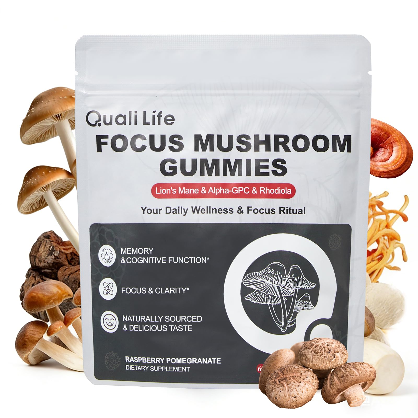 QualiLife Mushroom Gummies with Alpha-GPC & Rhodiola 12 Mushroom Complex with Lion s Mane Reishi Cordyceps Chaga & More Raspberry Pomegranate Flavor Vegan Non-GMO Pectin-Based 30 Servings