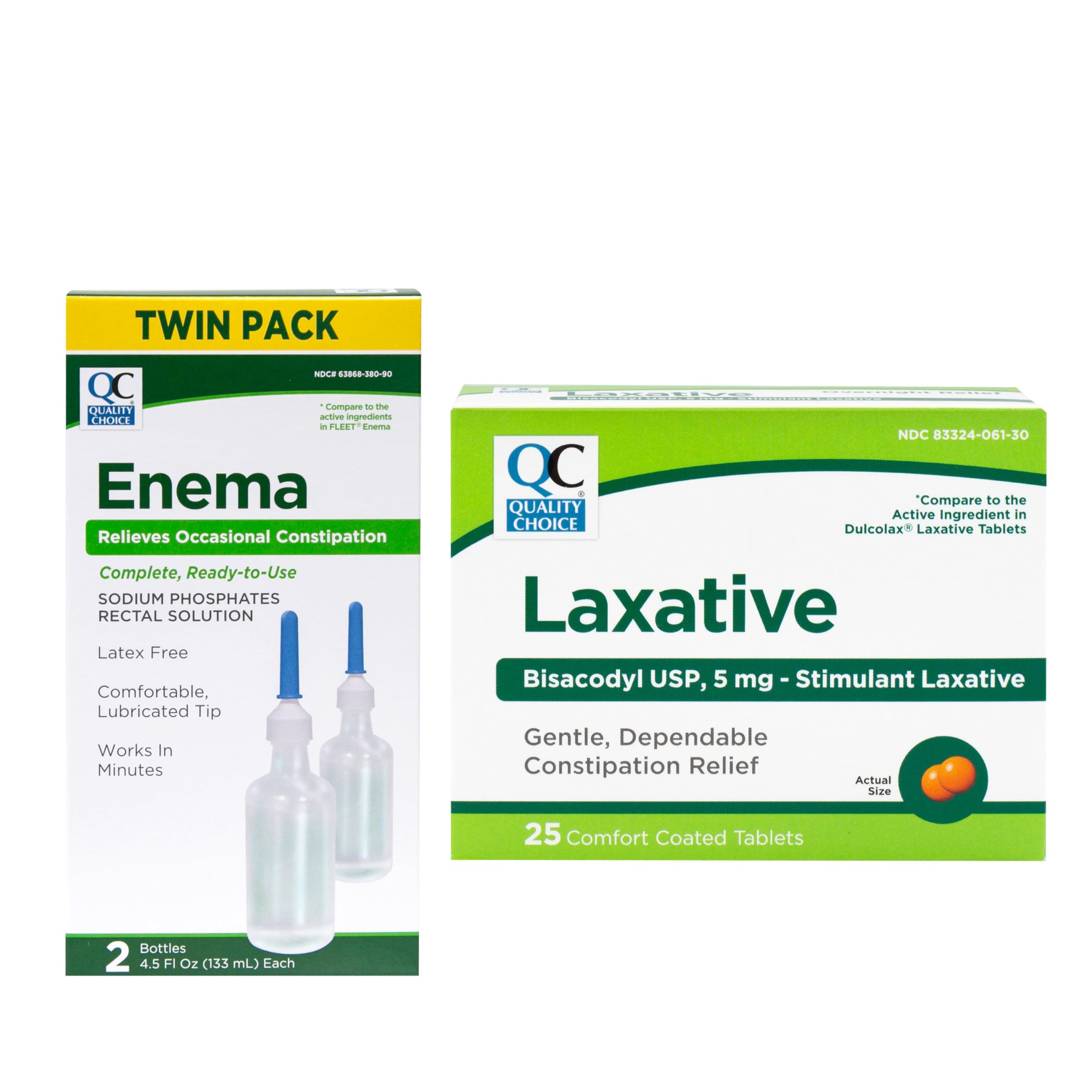Trusted Quality Choice products offer dependable over the counter relief with clinically backed ingredients that support digestive regularity and bowel movement. Enema bottles feature a soft comfortable tip and pre lubricated design for ease of use with no preparation required ideal for at home or on the go use when needed. Comfort coated bisacodyl 5 milligram tablets are designed to stimulate bowel movements and provide gentle overnight relief from irregularity or constipation. Each enema contains sodium phosphates rectal solution with a lubricated latex free tip and delivers fast acting relief for occasional constipation and discomfort. Two part constipation relief system includes a ready to use enema twin pack and a 25 count bottle of stimulant laxative tablets for flexible and effective support.