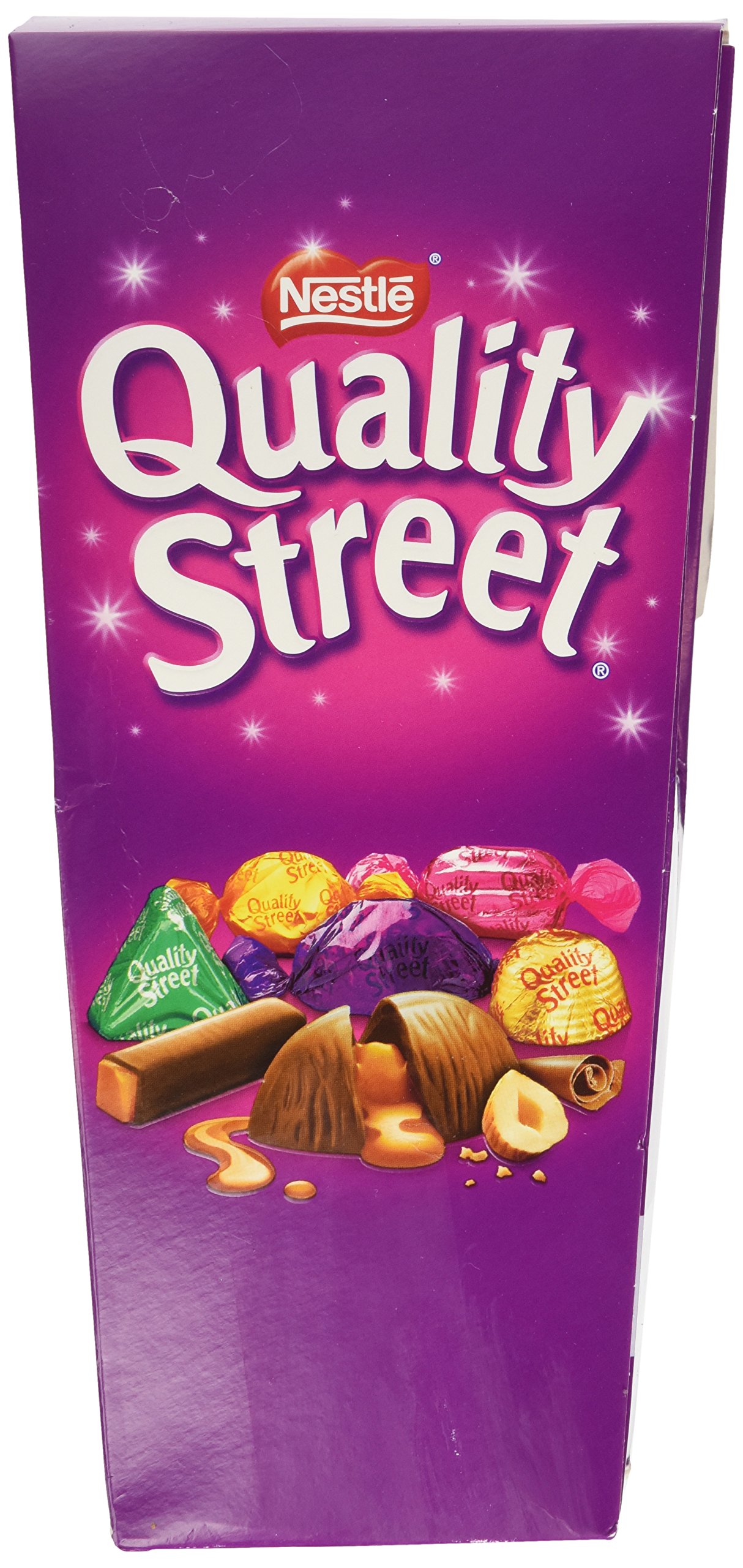 12 iconic Quality Street candies in an assortment of milk and dark chocolates and caramels. An assortment of varieties with something for everyone. Perfect for sharing magical moments. Shake 'n' share your carton to share the assortment with your friends and family. The chocolates may turn white in warm conditions due to the movement of cocoa butter to the surface, but are still safe to enjoy. Important: Young children (under 4 years) have limited chewing abilities and may choke on small candies. INGREDIENTS Sugar, glucose syrup, condensed skimmed milk, cocoa butter, cocoa mass, vegetable fat (palm), dried whole milk, glucose-fructose syrup, coconut, lactose and lactose proteins (from milk), whey powder (from milk), butter (from milk), hazelnuts, butterfatQuality Street Carton 265 gDESCRIPTION DU PRODUIT DESCRIPTION DU PRODUIT 12 bonbons emblématiques de Quality Street dans un assortiment de chocolats au lait et noirs et caramels. Un assortiment de variétés qui a quelque chose pour tout le monde. Parfait pour partager des moments magiques. Shake 'n' partager votre carton, pour partager l'assortiment avec vos amis et fami Les chocolats peuvent devenir blancs dans des conditions chaudes en raison du déplacement du beurre de cacao à la surface, mais sont toujours sûrs à apprécier. Important: Les jeunes enfants (moins de 4 ans) ont une capacité de mastication limitée et peuvent s'étouffer avec de petits bonbons. INGRÉDIENTS Sucre, sirop de glucose, lait écrémé condensé, beurre de cacao, masse de cacao, graisse végétale (palme), lait entier séché, sirop de glucose-Fructose, noix de coco, lactose et protéines de lactose (à partir de lait), poudre de lactosérum (à partir de lait), beurre (de lait), noisettes, graisses de beurre